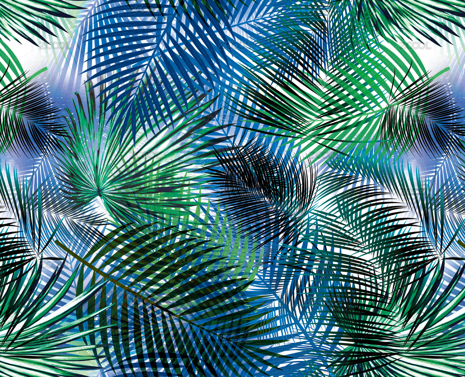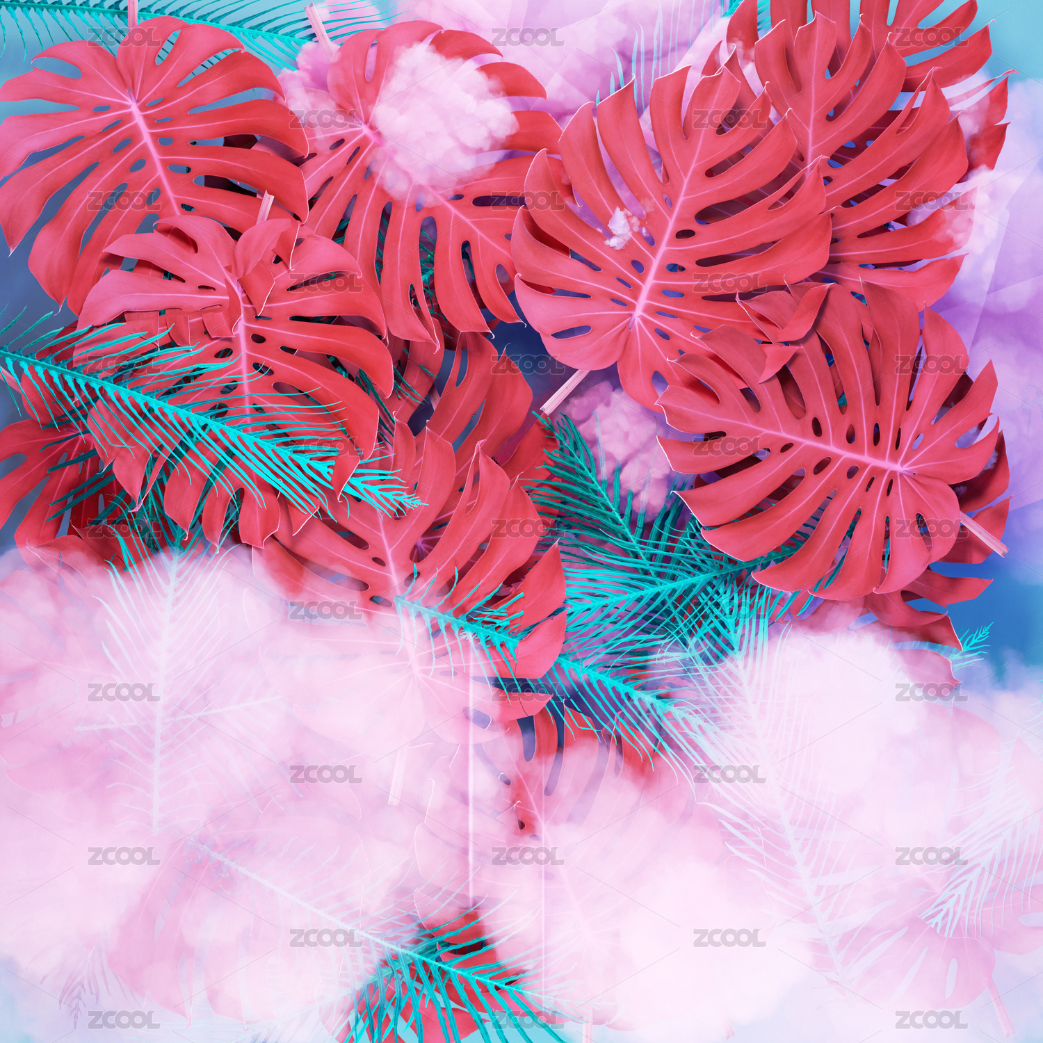 蒸汽波风格的热带棕榈叶堆积组成的背景素材
