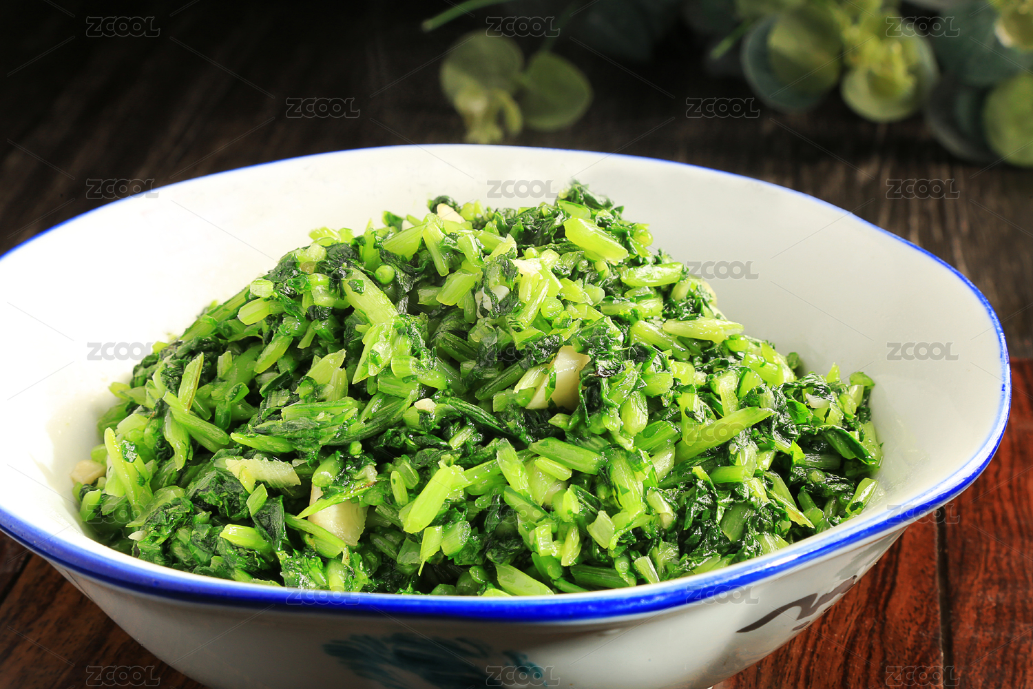 木板上蓝边白瓷碗中的清炒萝卜菜