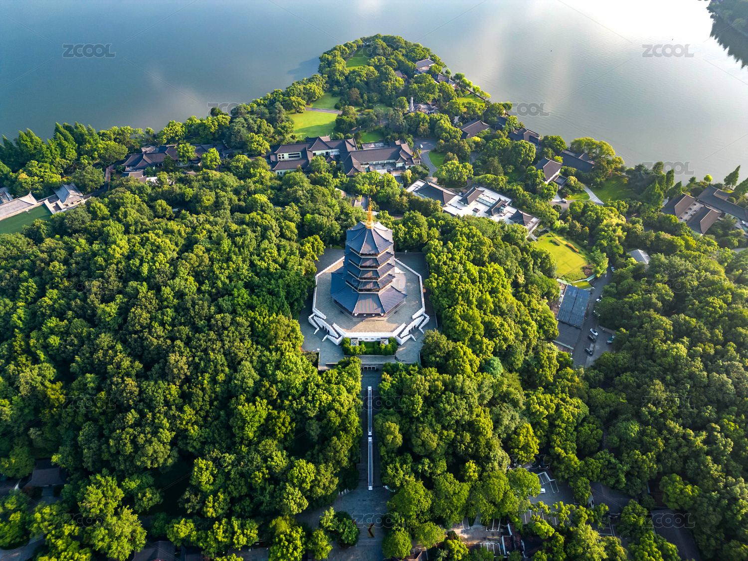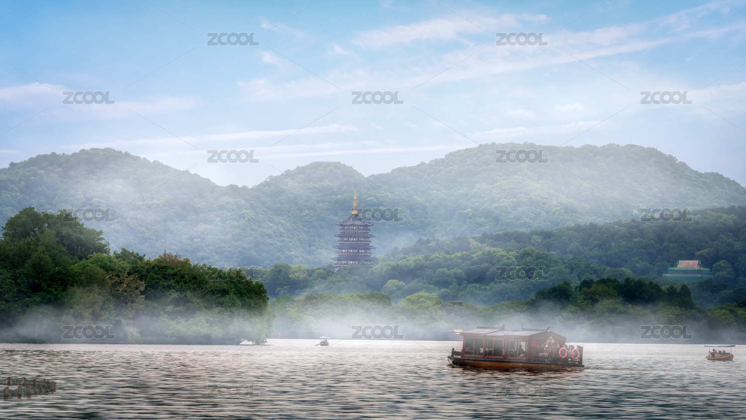 云雾缭绕的西湖雷峰塔中式园林景观