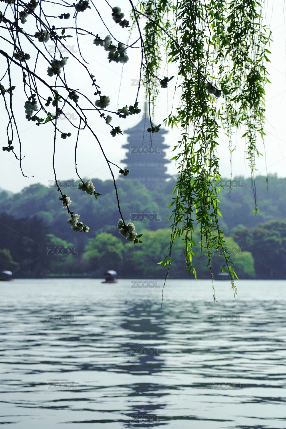 西湖柳树桃花和雷锋塔