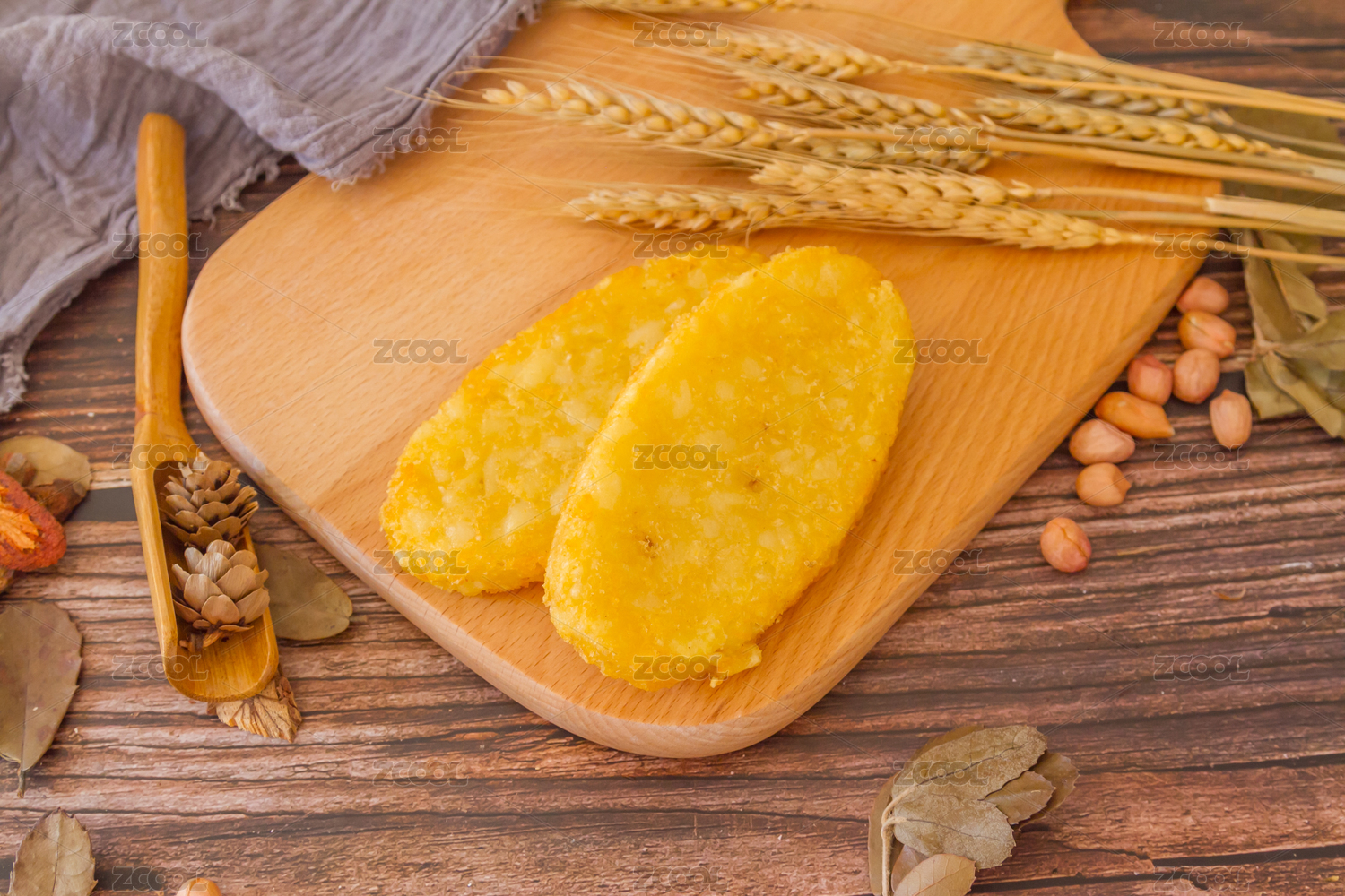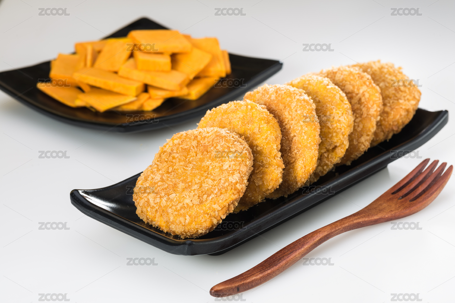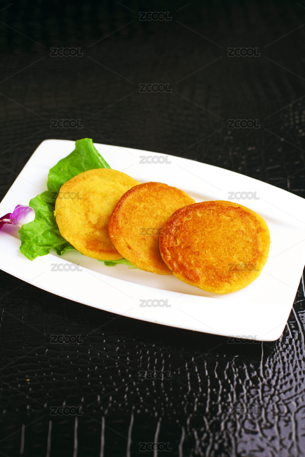 灰色背景上一个浅蓝色圆盘里的煎南瓜饼