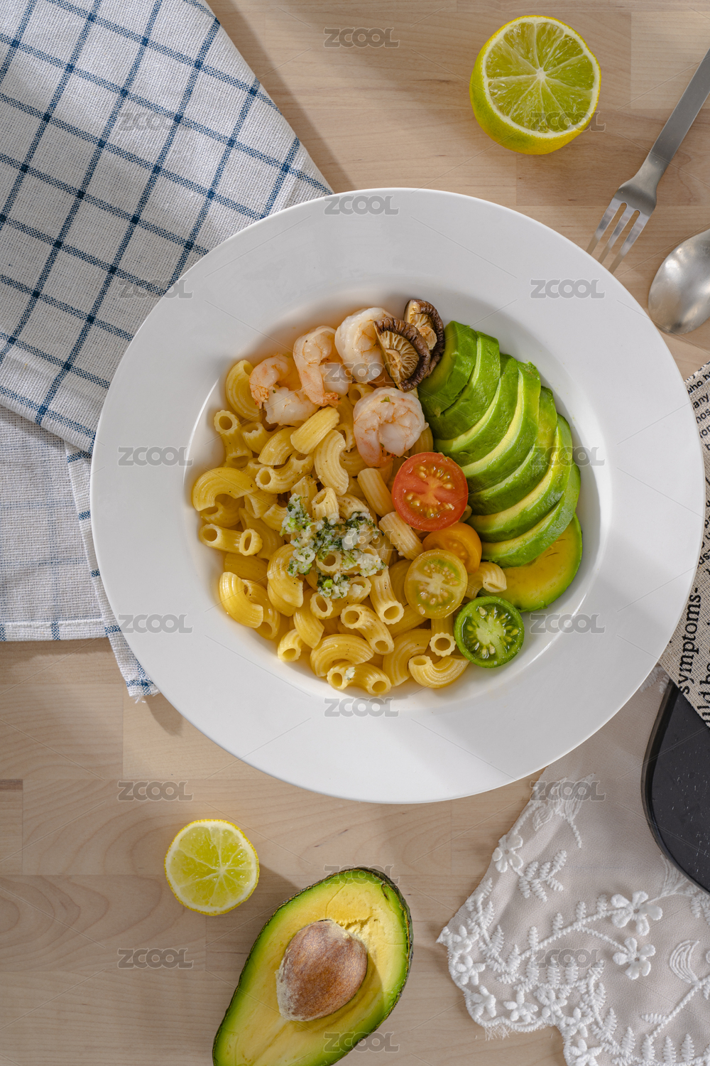 可爱小孩享受彩色果蔬鸡肉串通心粉意面
