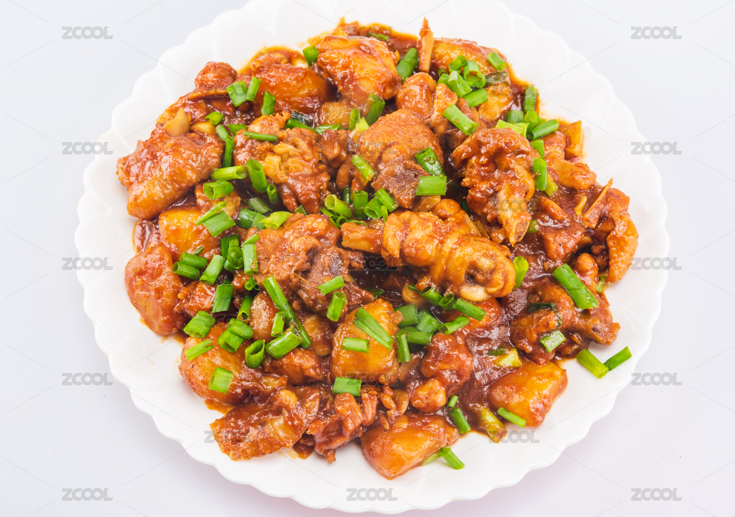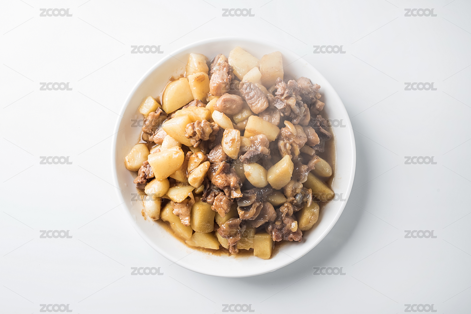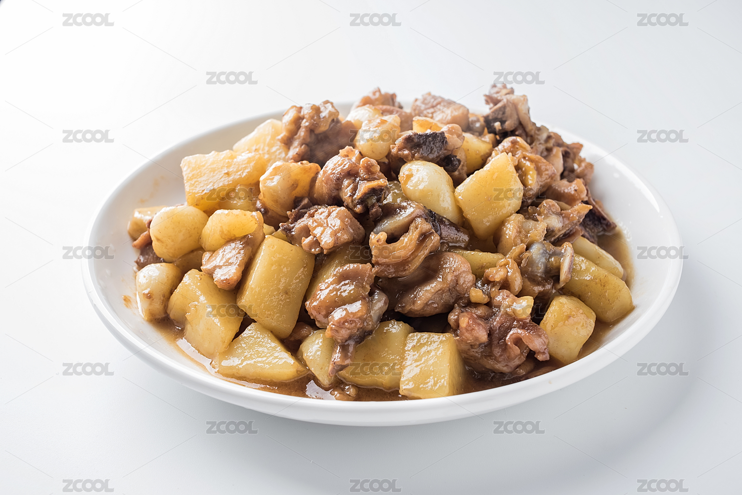 白色背景上的一盘土豆焖鸡