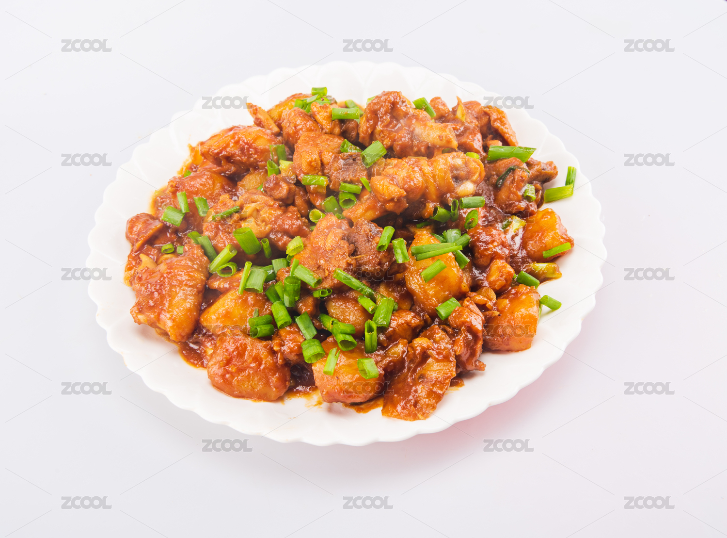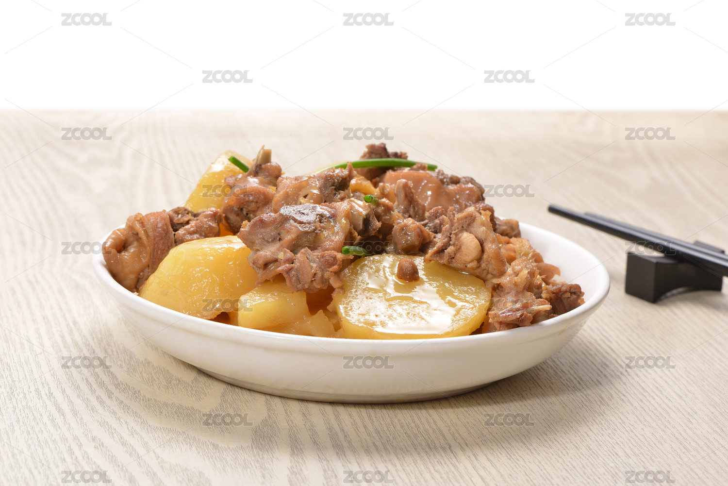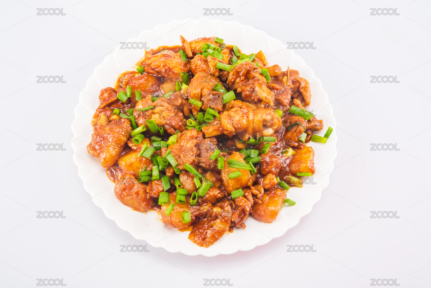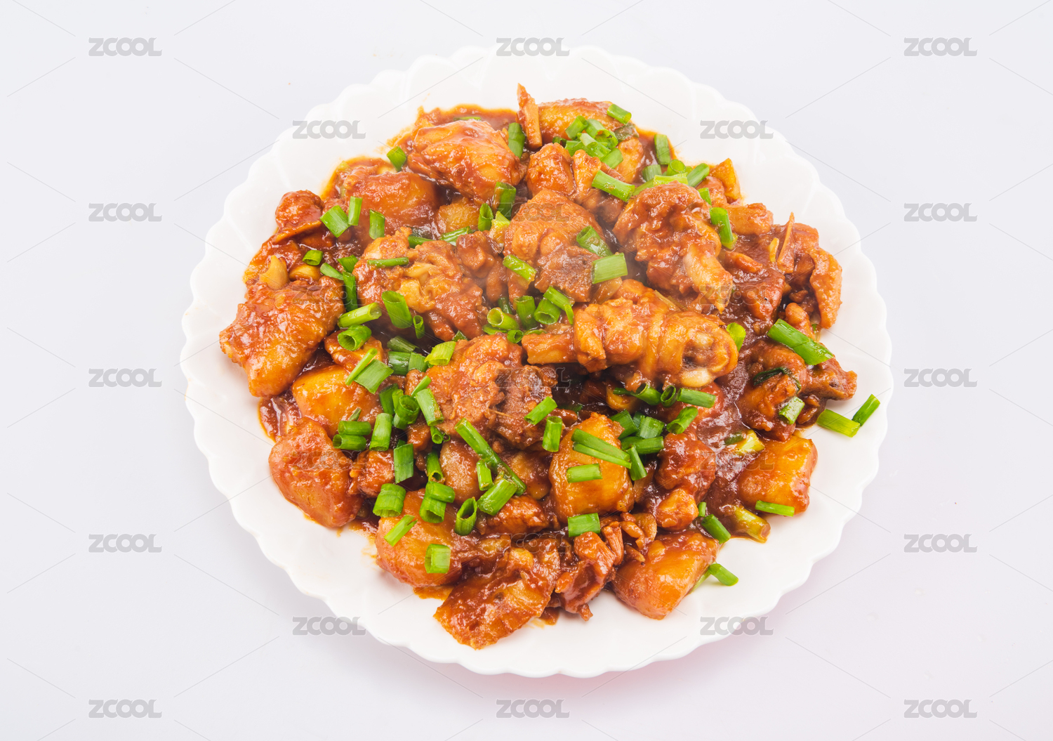 白色背景上的一盘土豆焖鸡