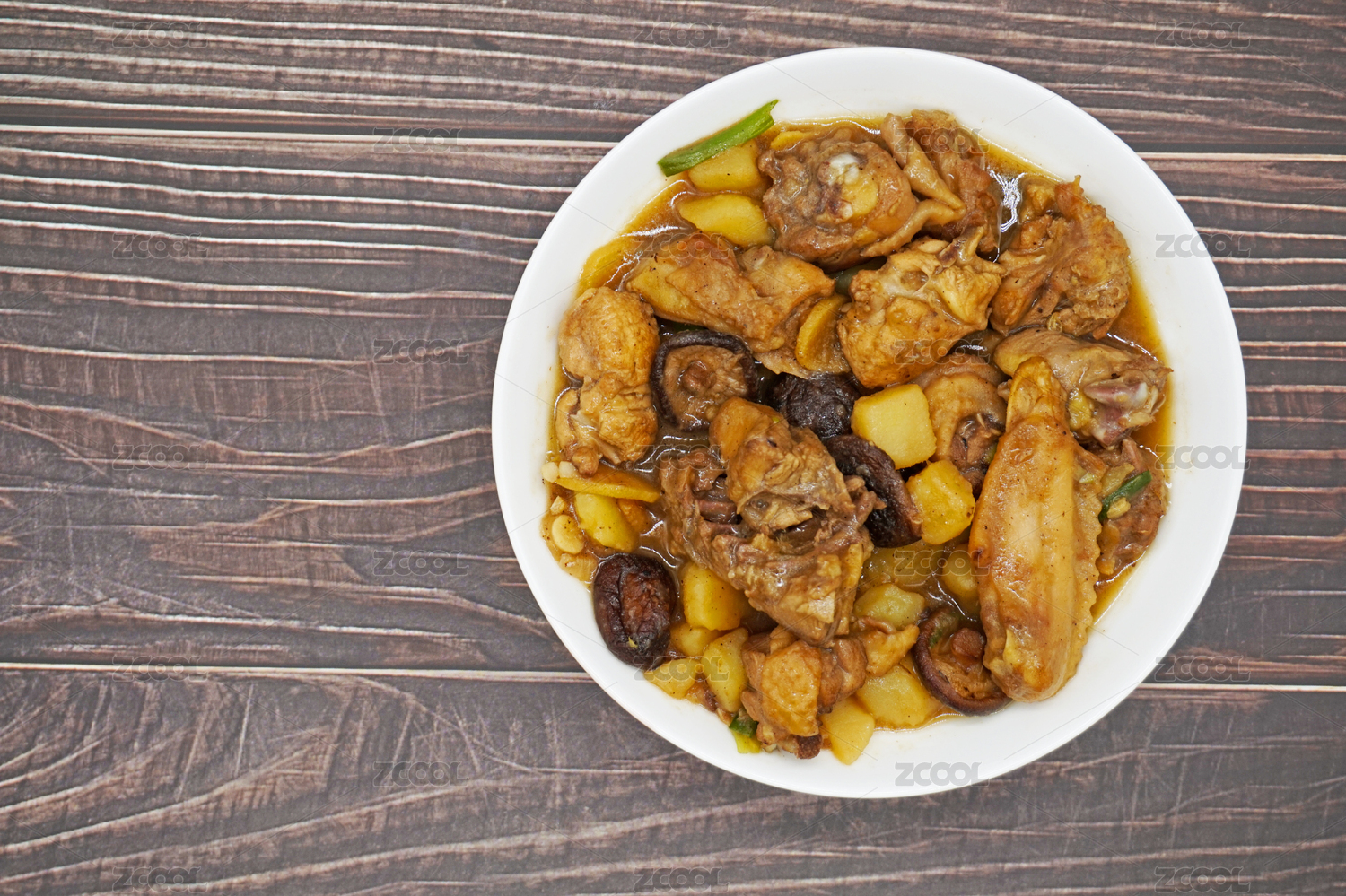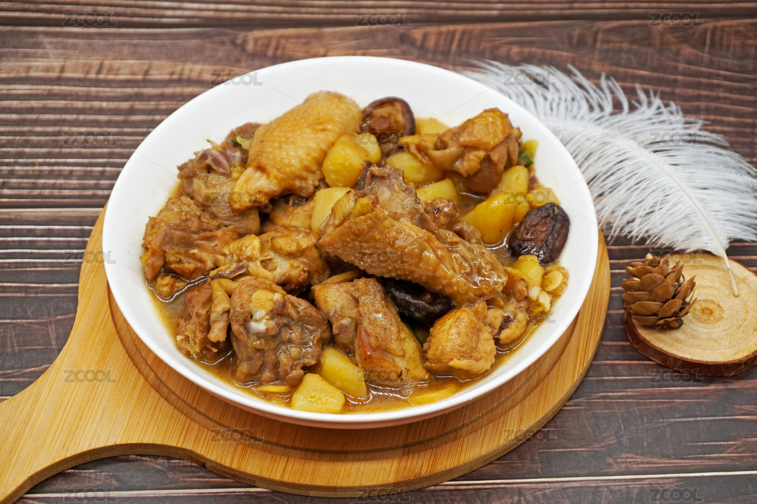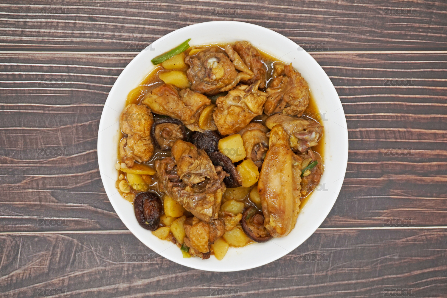 木桌背景中一盘土豆焖鸡肉