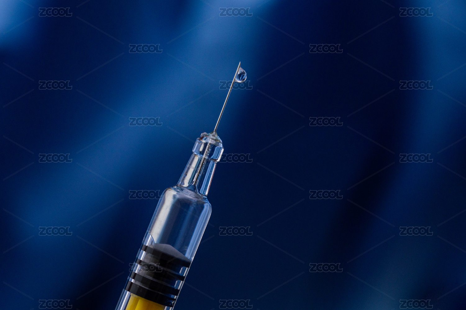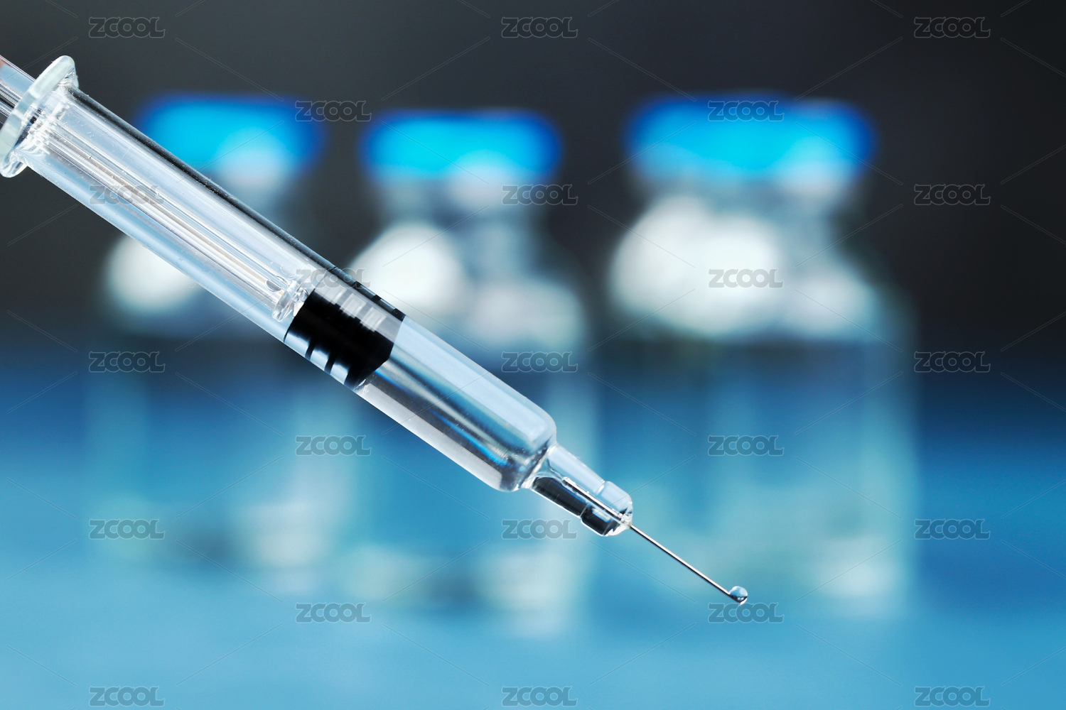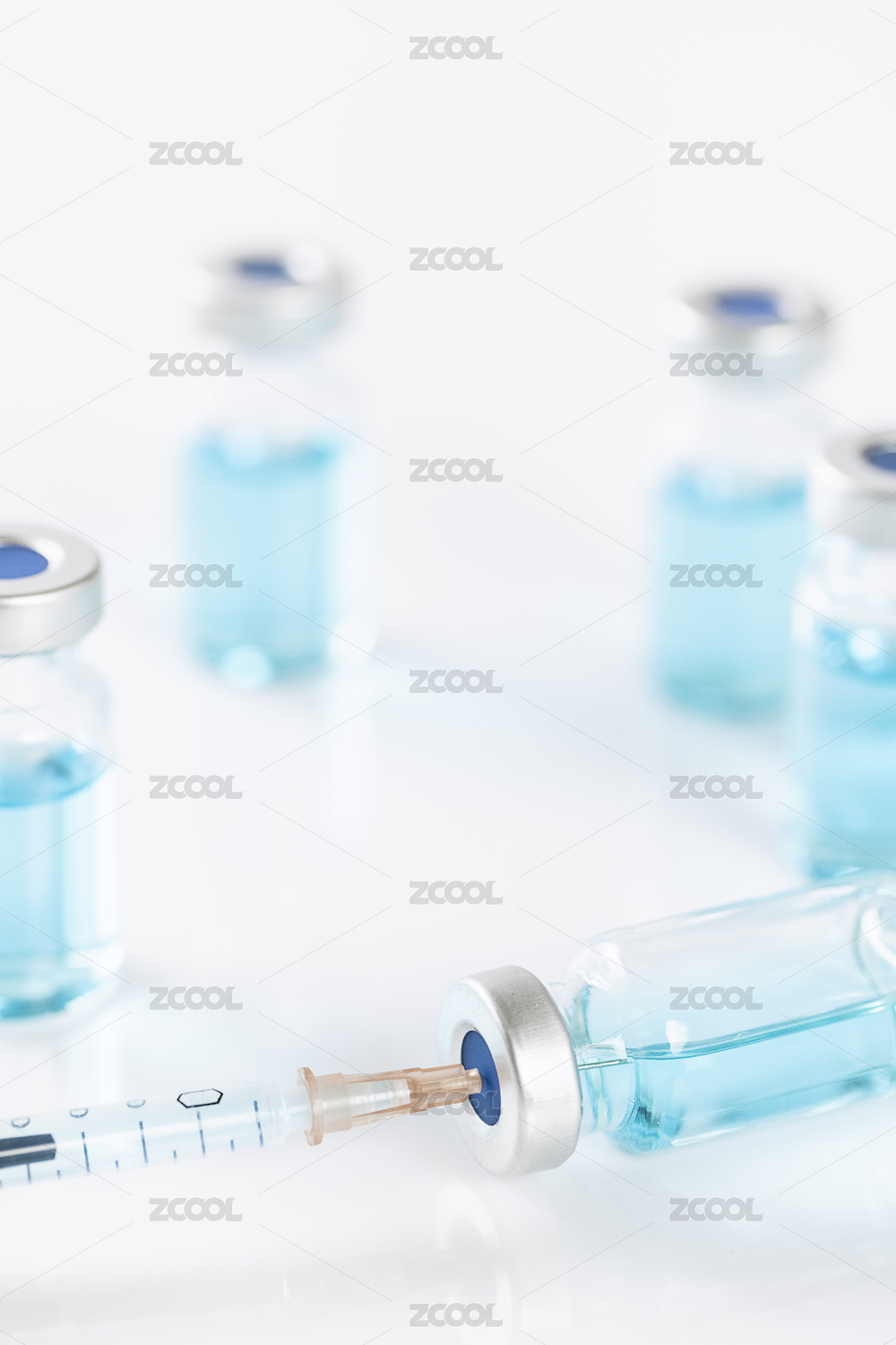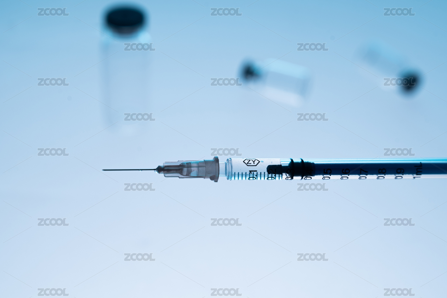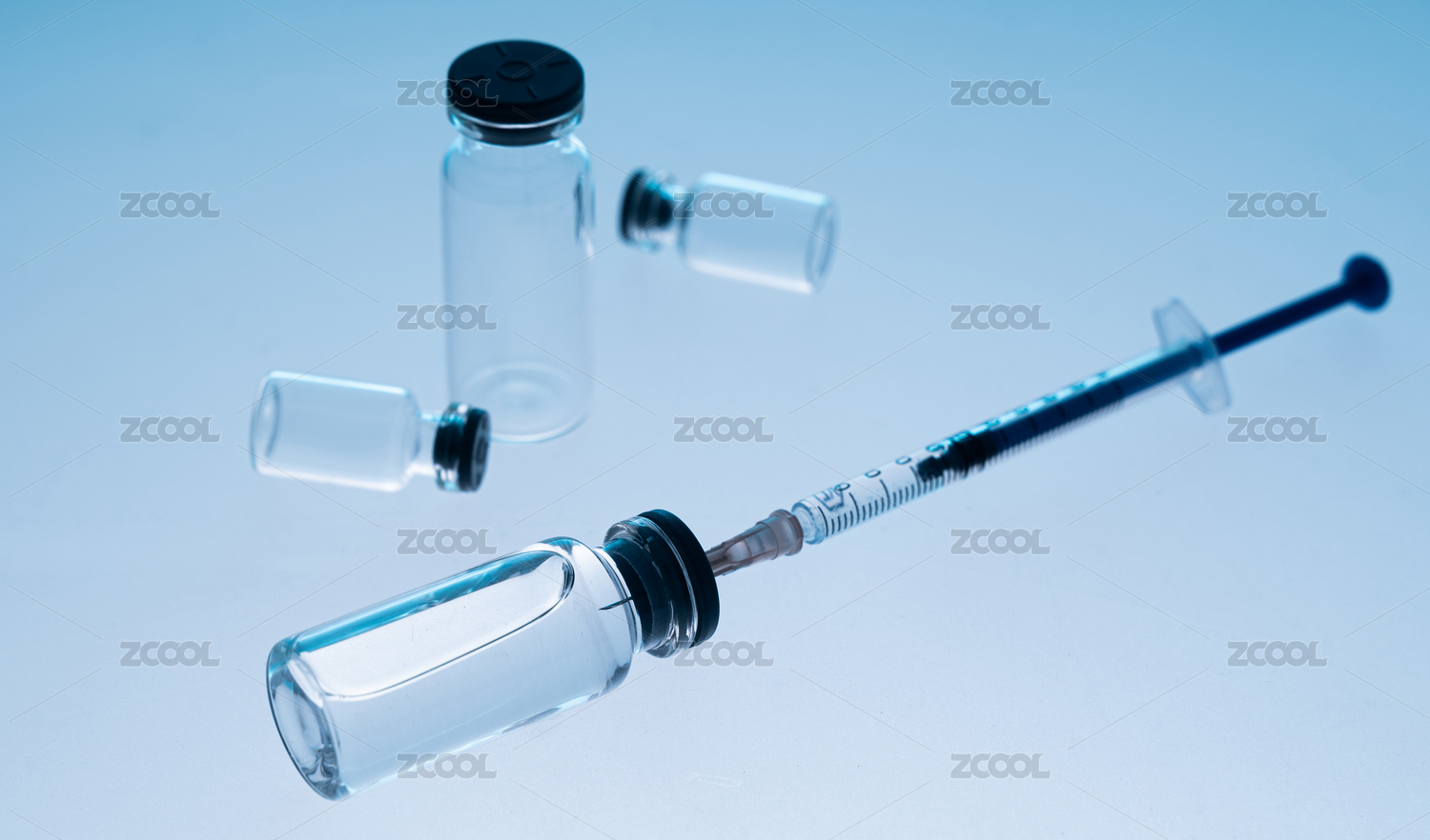 疫苗注射器和玻璃药瓶在蓝色背景上