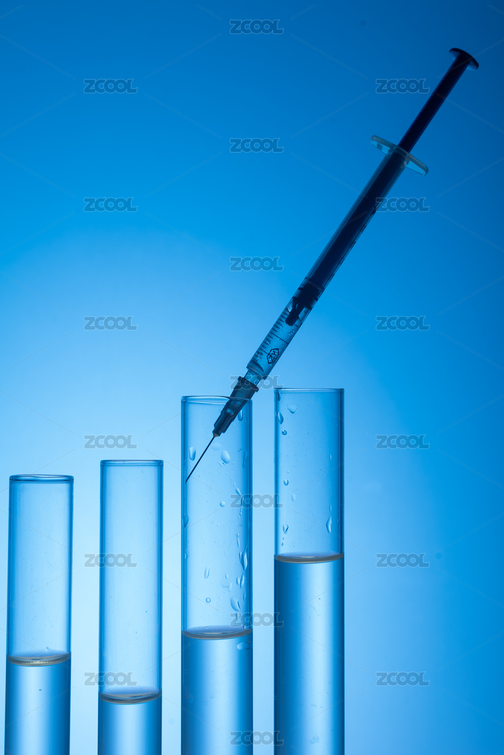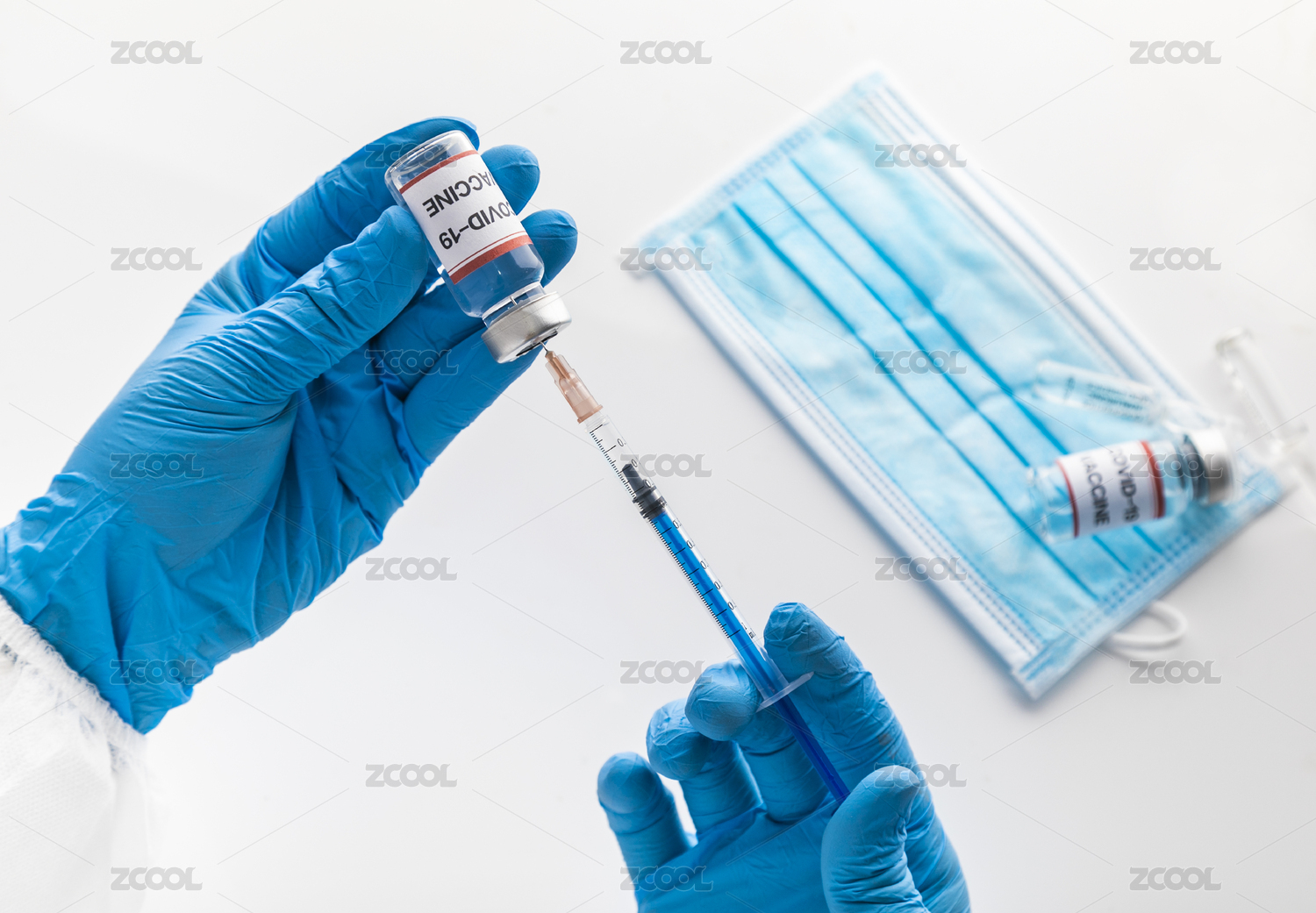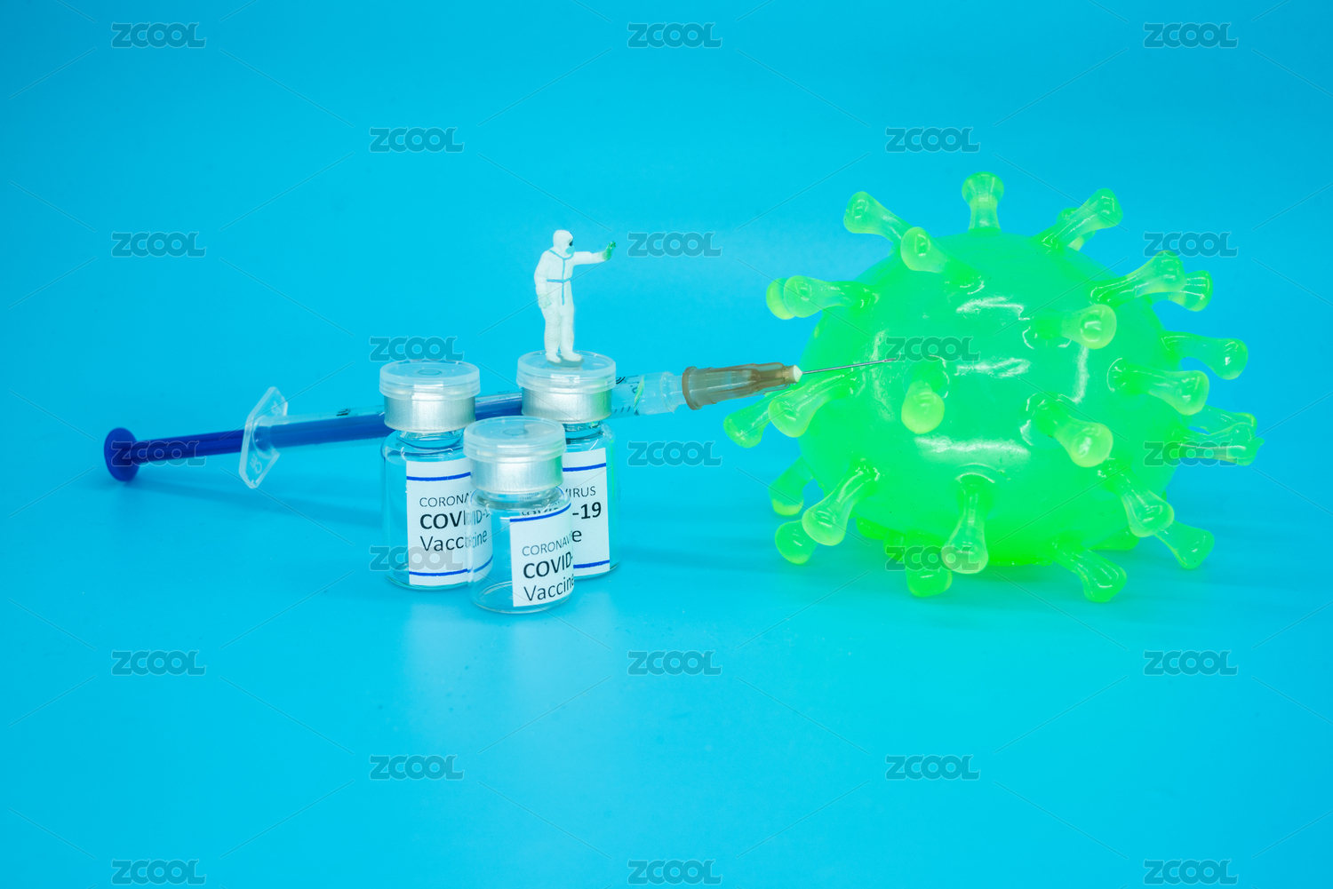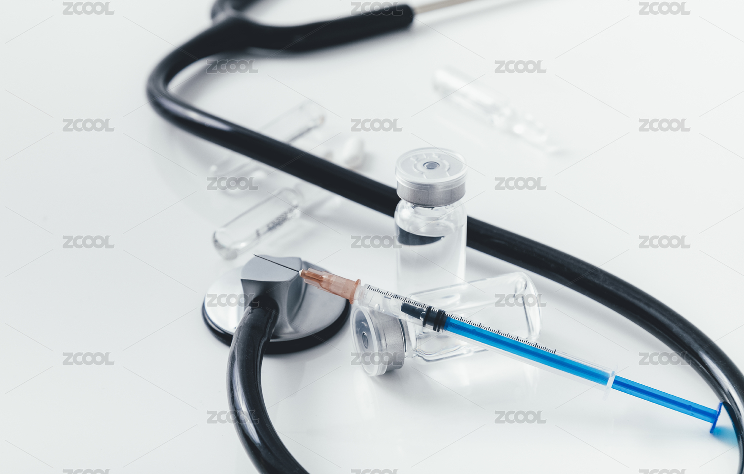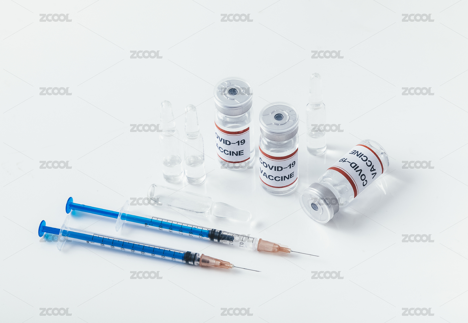 疫苗注射器和玻璃药瓶在蓝色背景上