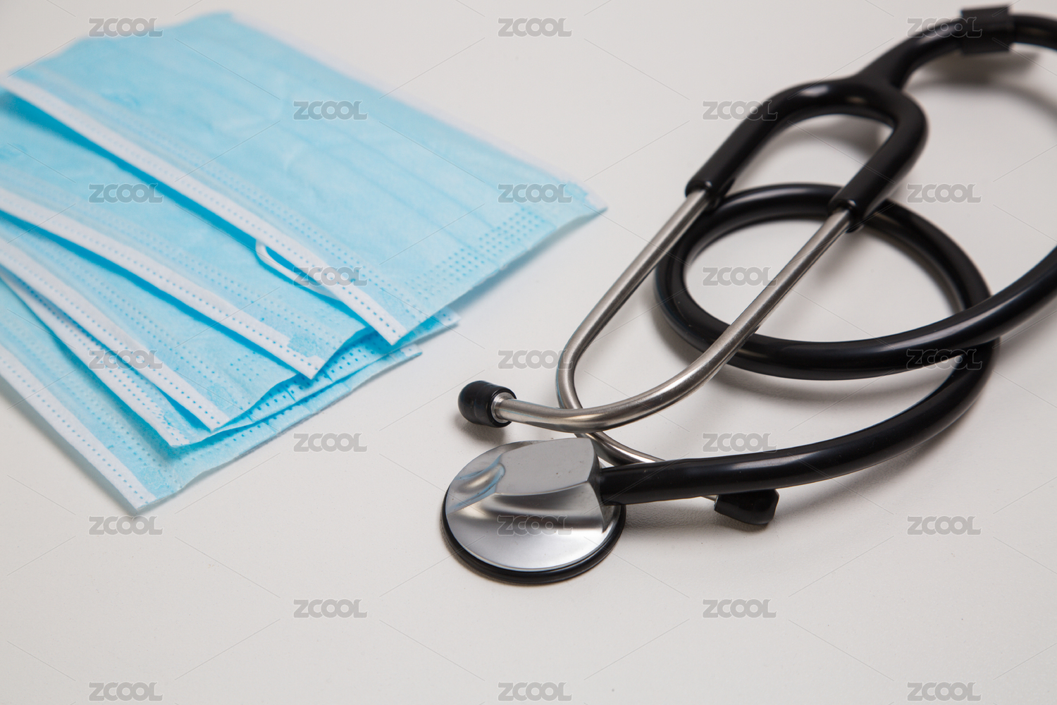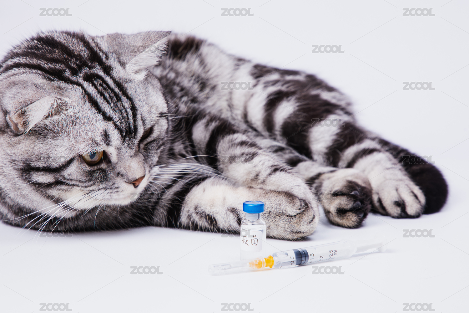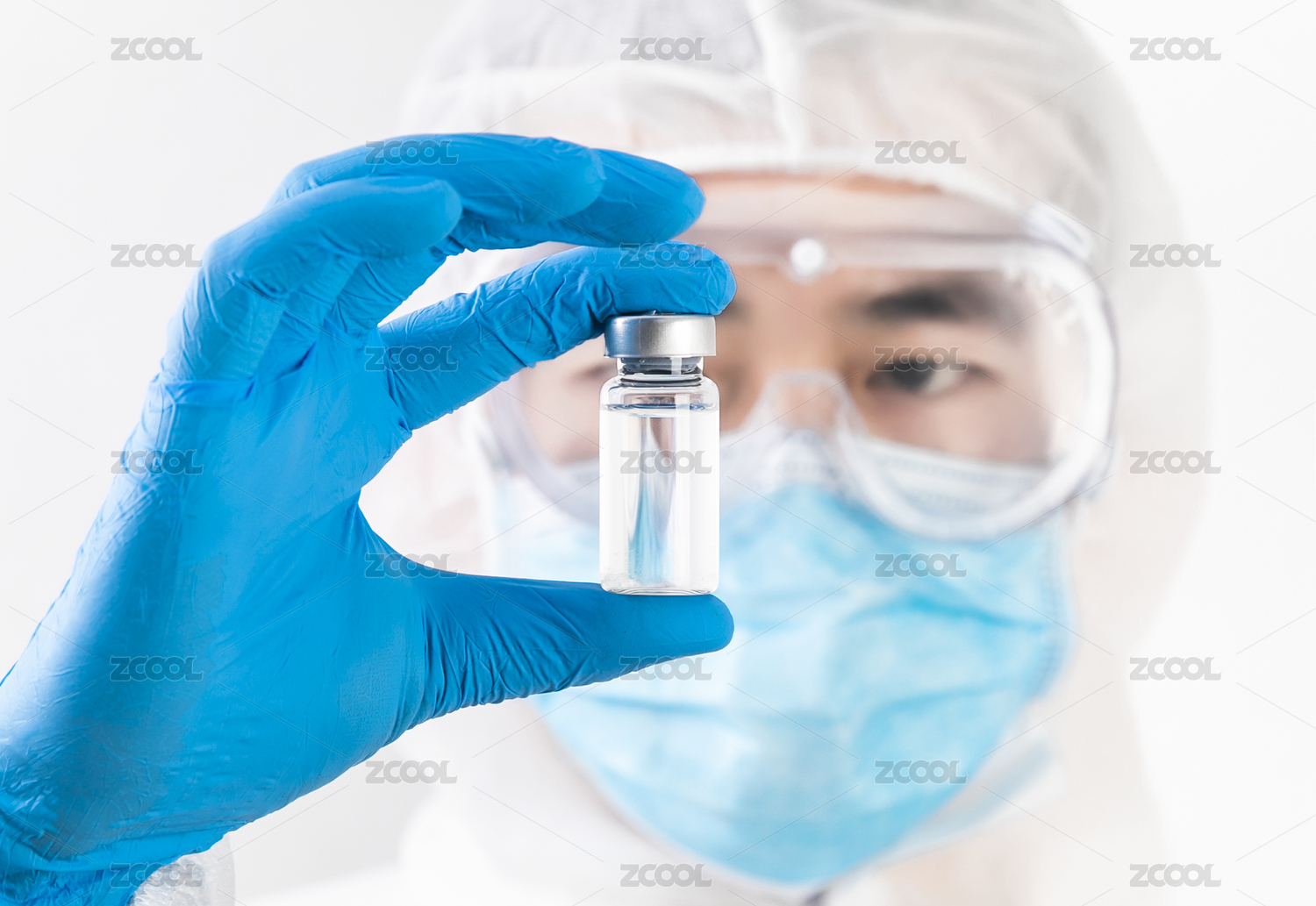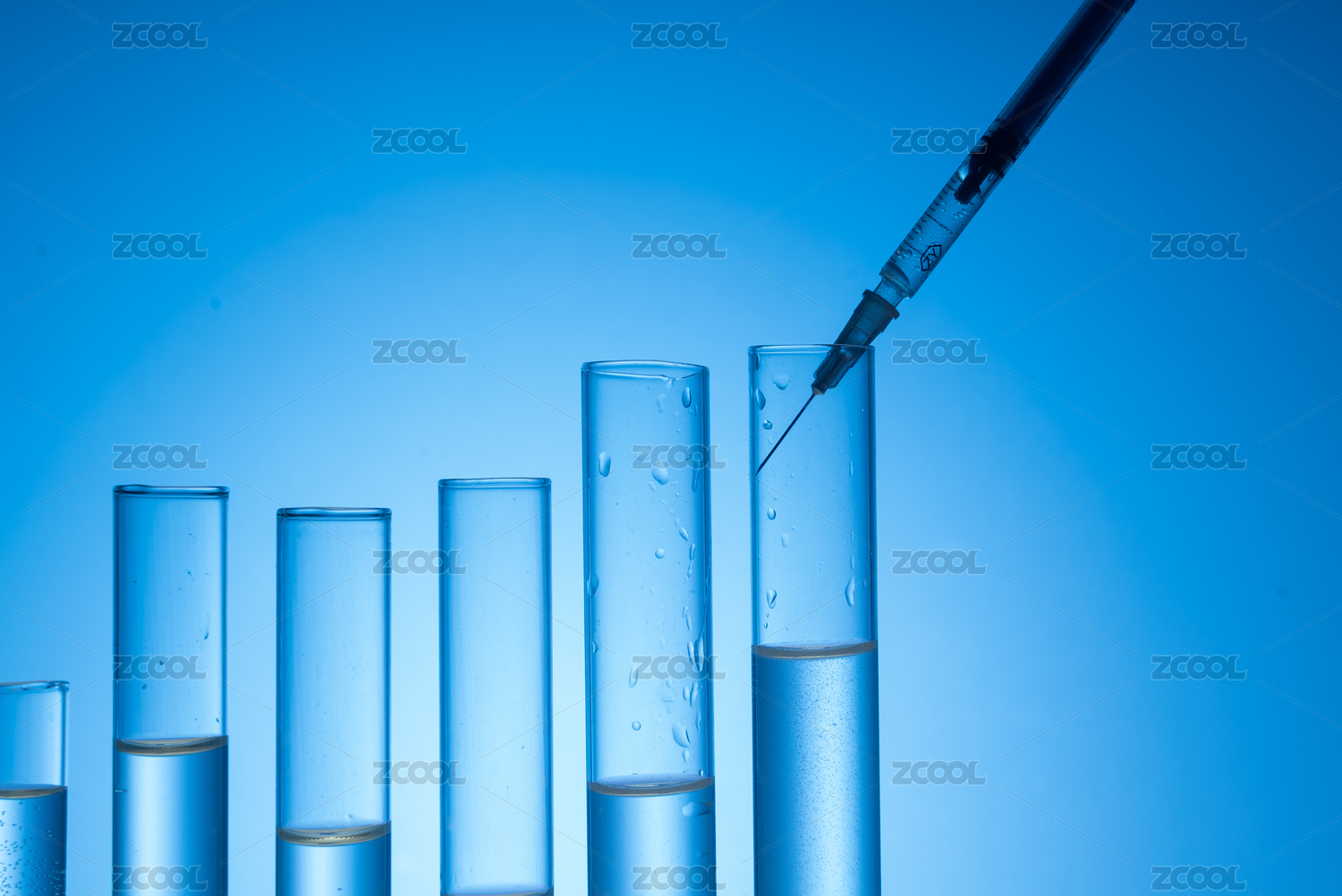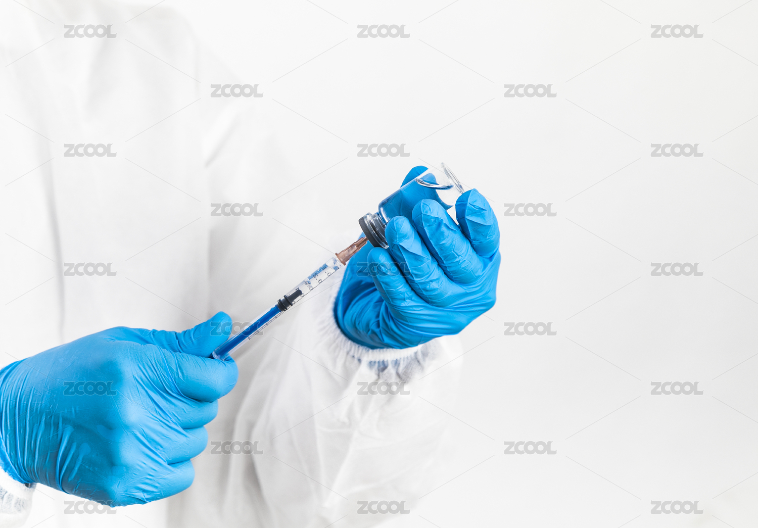 疫苗注射器和玻璃药瓶在蓝色背景上