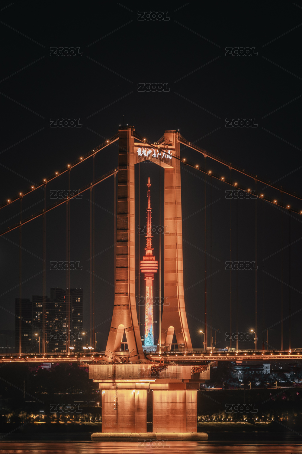 武汉鹦鹉洲长江大桥与龟山电视塔夜景