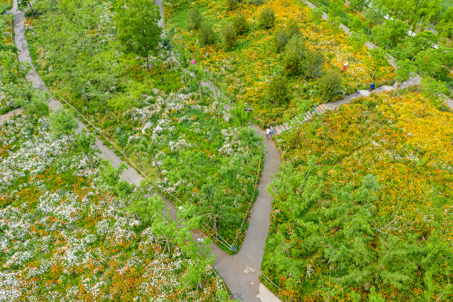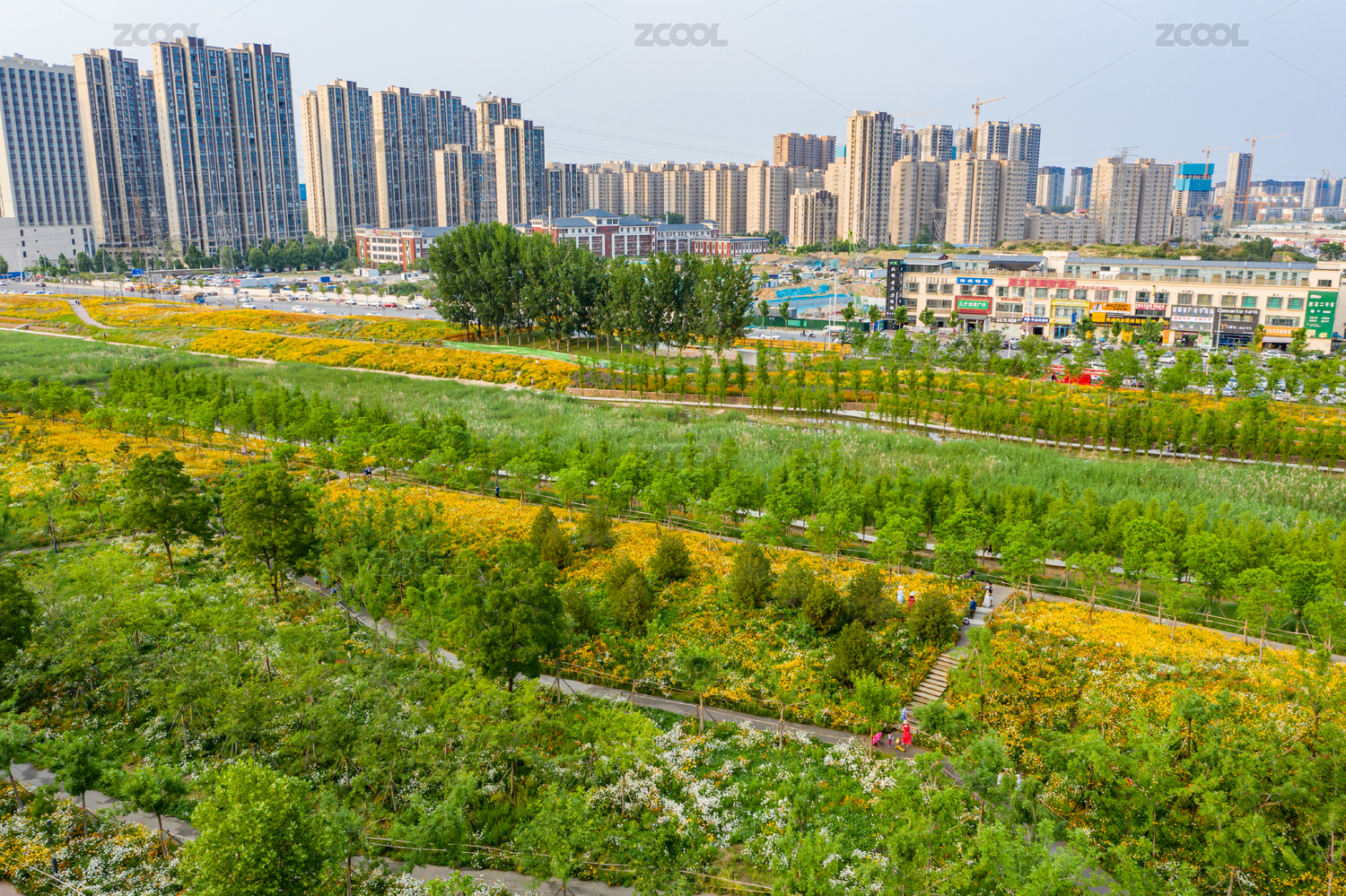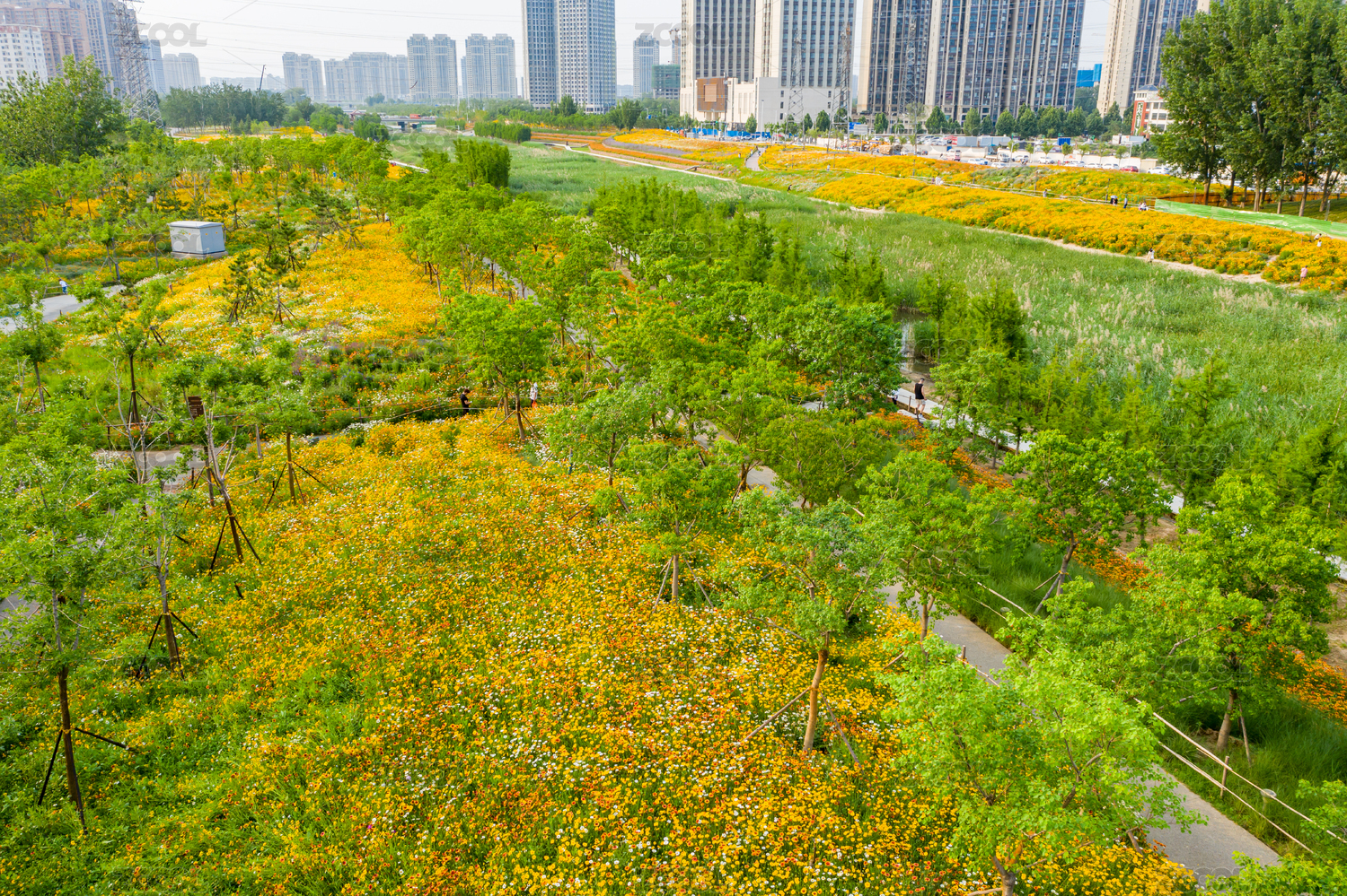 航拍郑州东风渠生态文化公园花田花海小野花