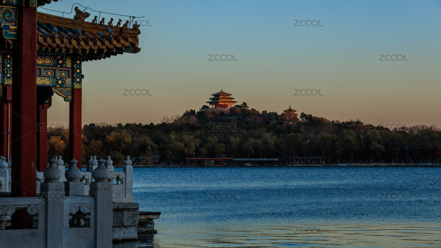 雪后颐和园万春亭黄昏日落时分的唯美光影