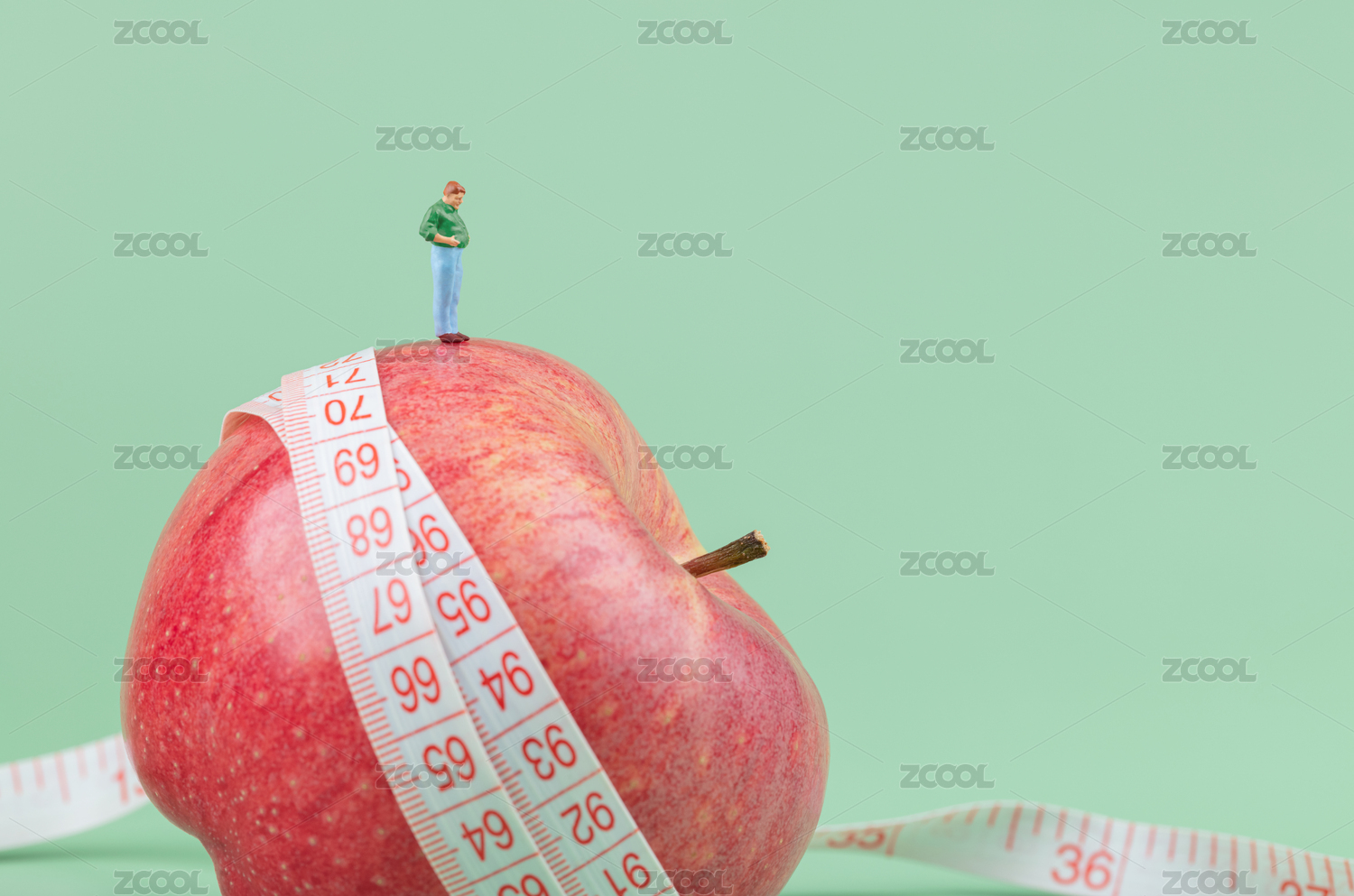 卷尺苹果上的一个大肚子大腰围男性胖子