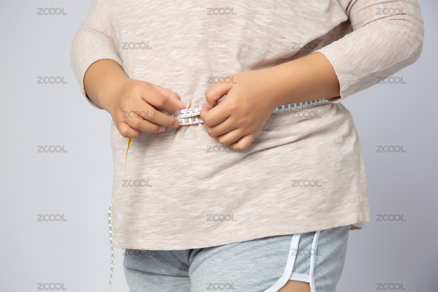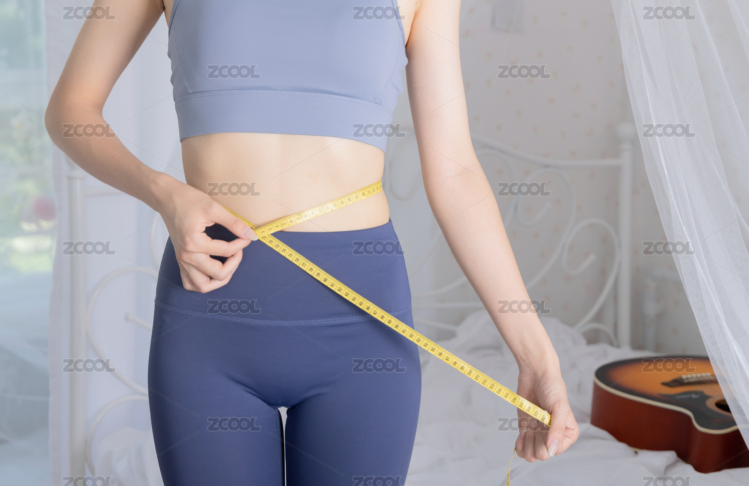 美女拿着皮尺卷尺测量自己的腰围减肥概念