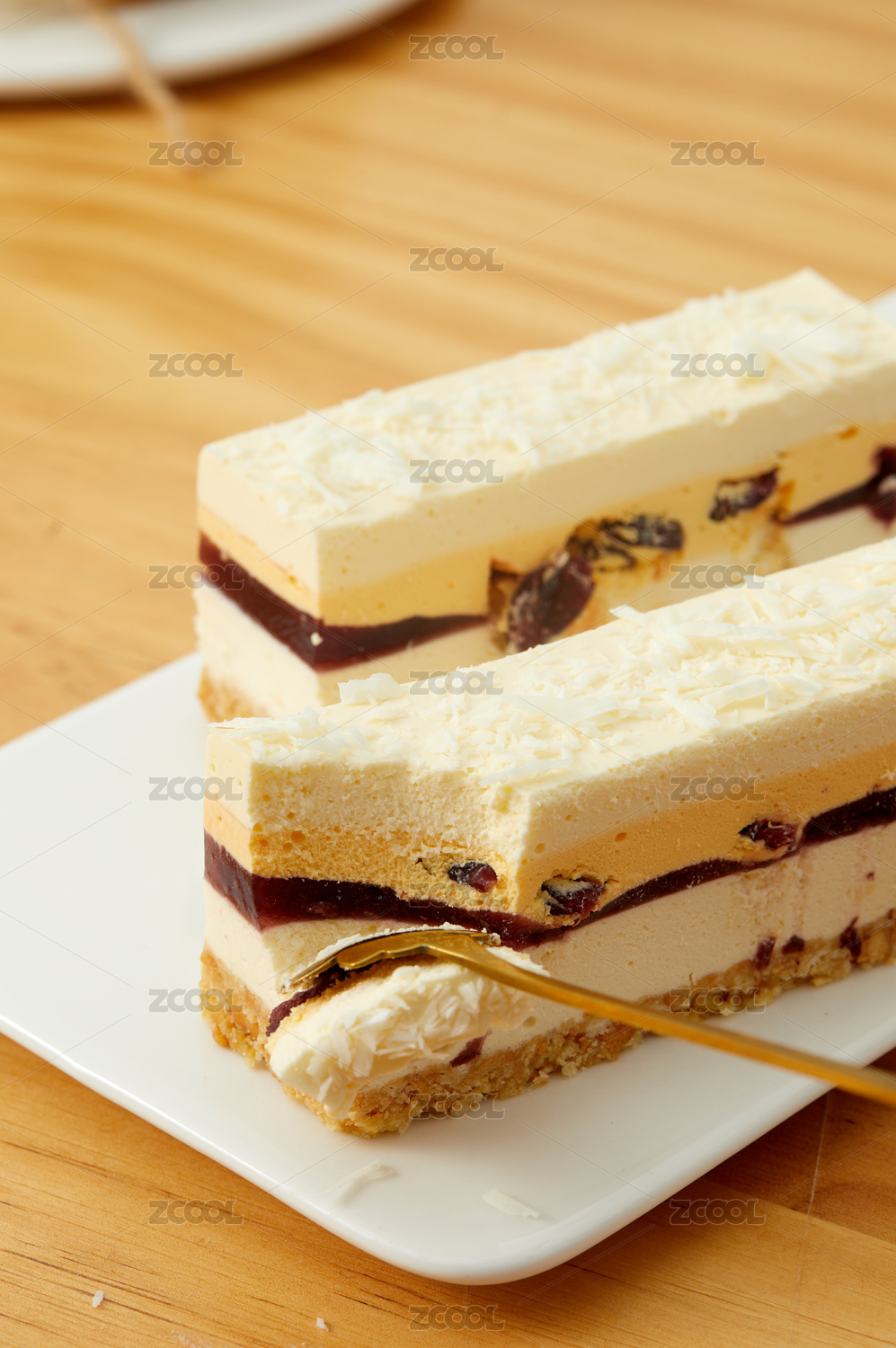 木质桌面上摆盘子里被勺子挖了一勺的蛋糕