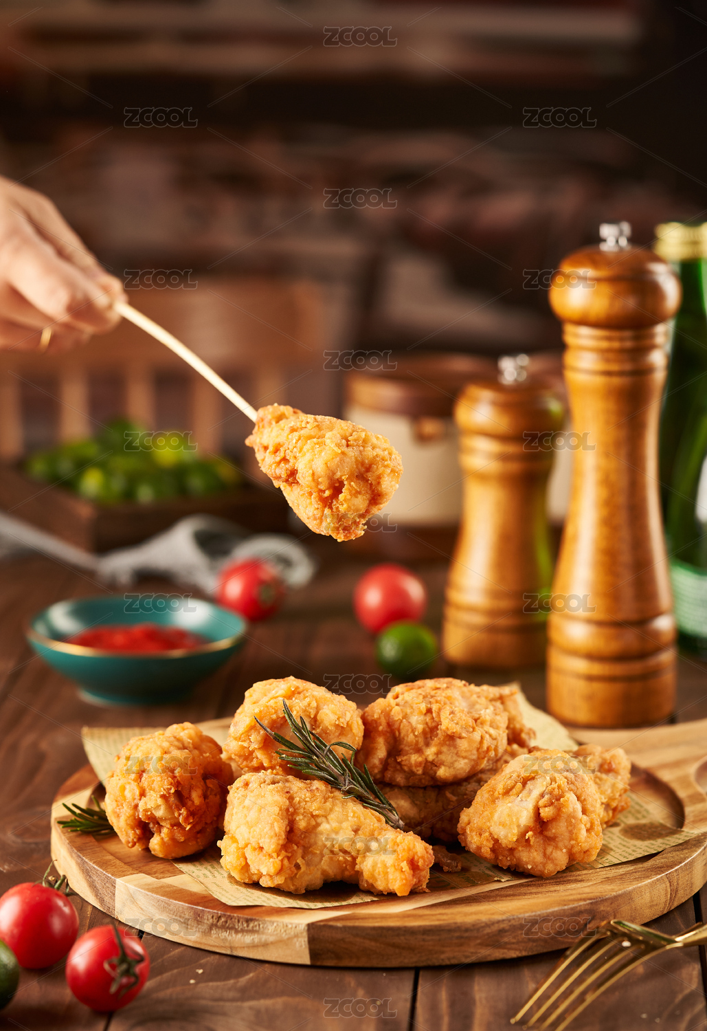 木质桌面上一只手用竹签叉起一个炸鸡腿