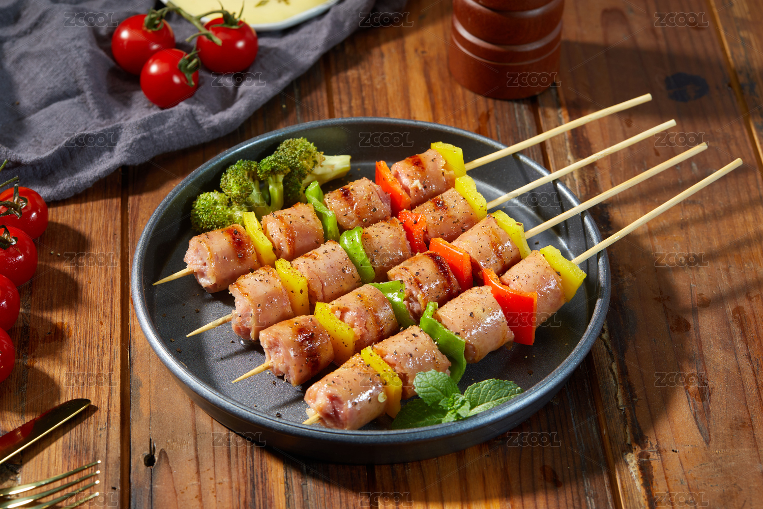 木质桌面上圆盘子里的木签穿起来烤肠串