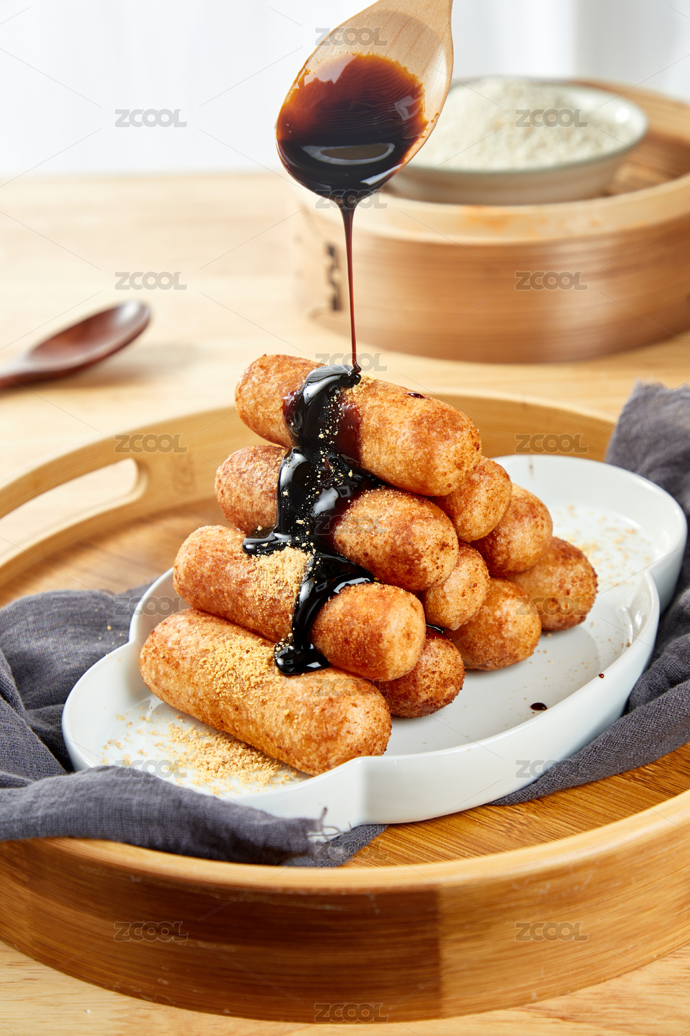 木质桌面上圆盘里一碗红糖流淌的红糖糍粑