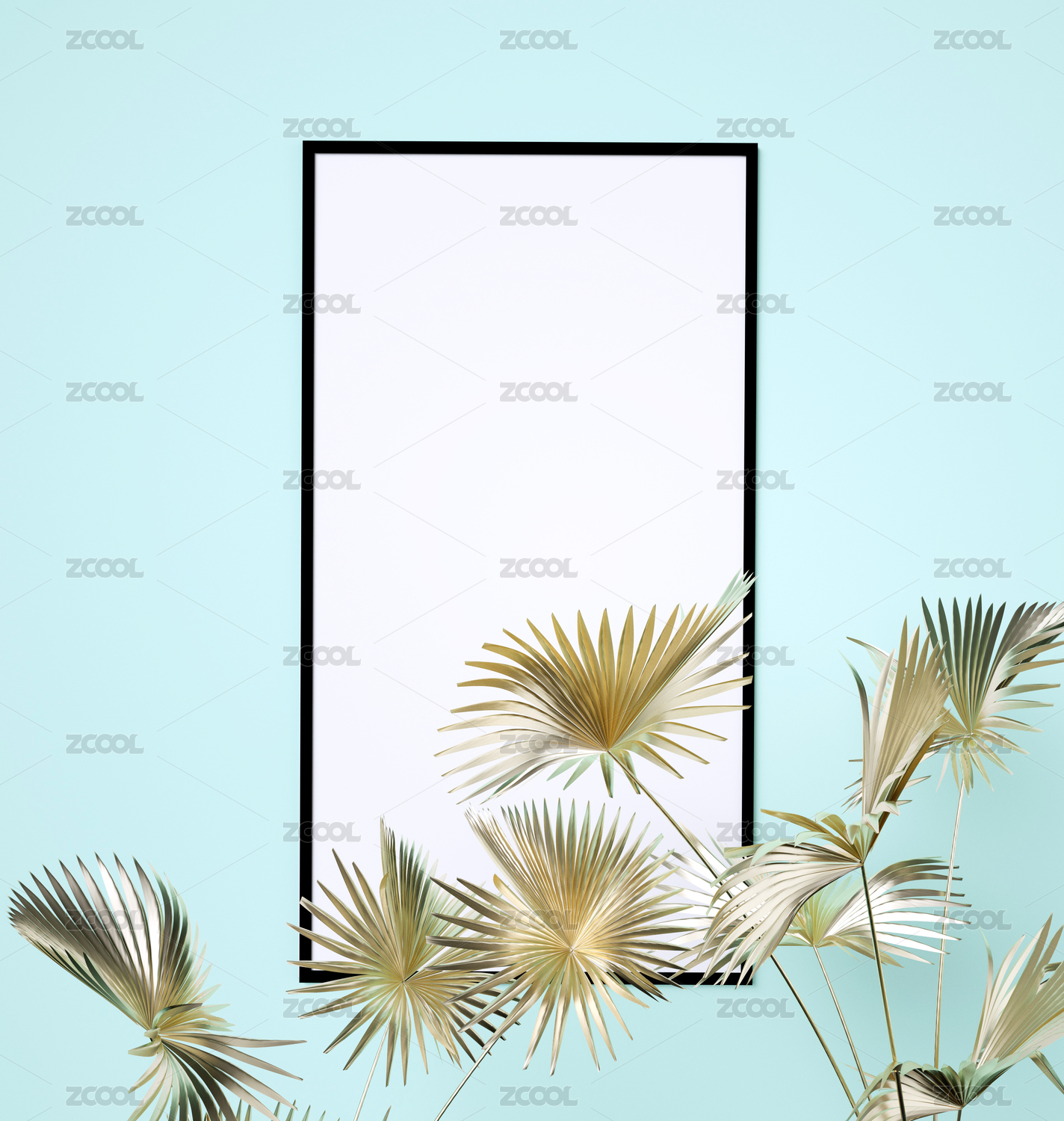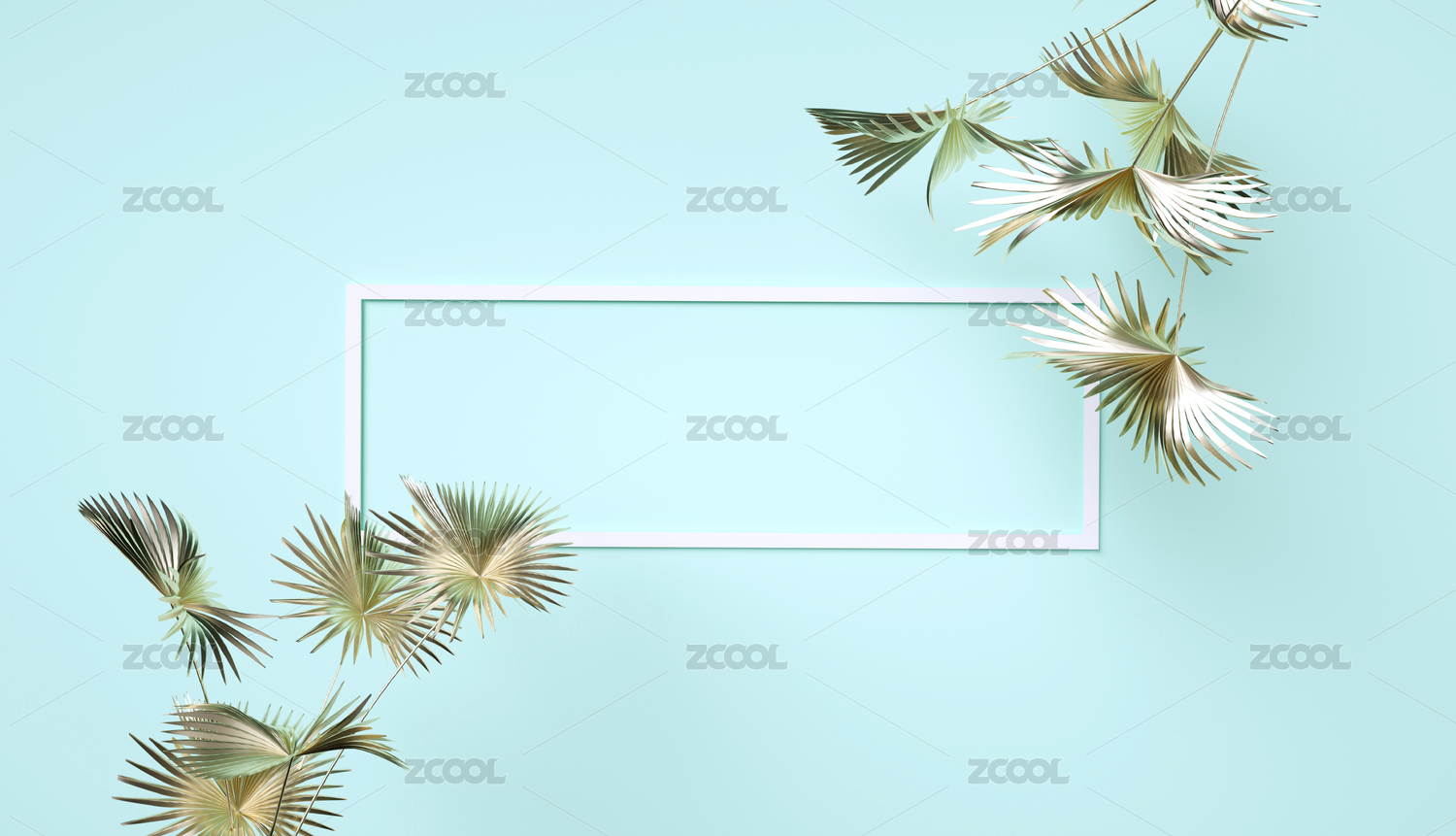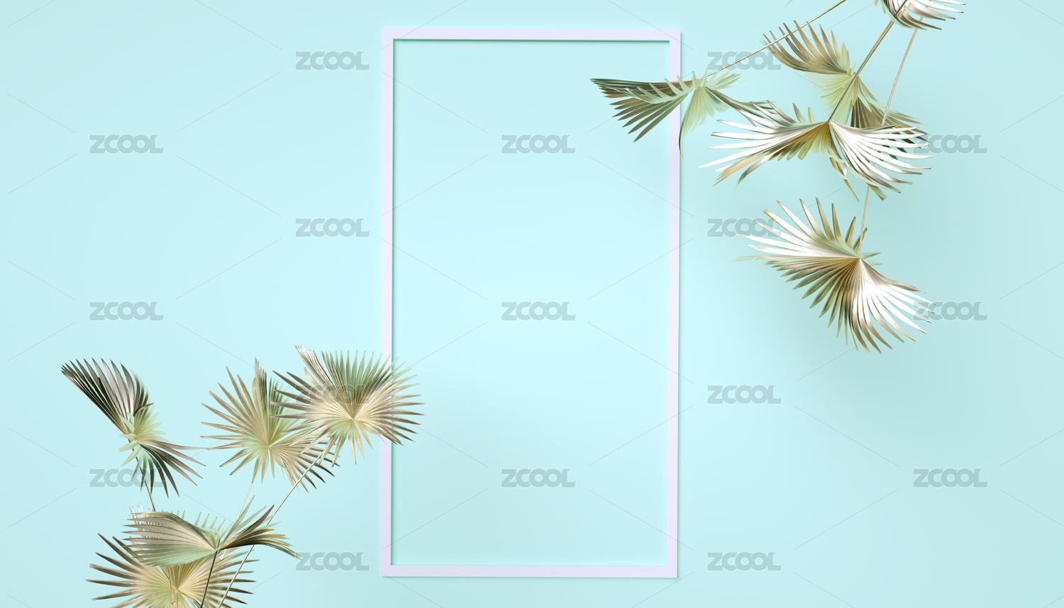 金色植物叶片与相框组成的三维渲染柔色风格留白背景图