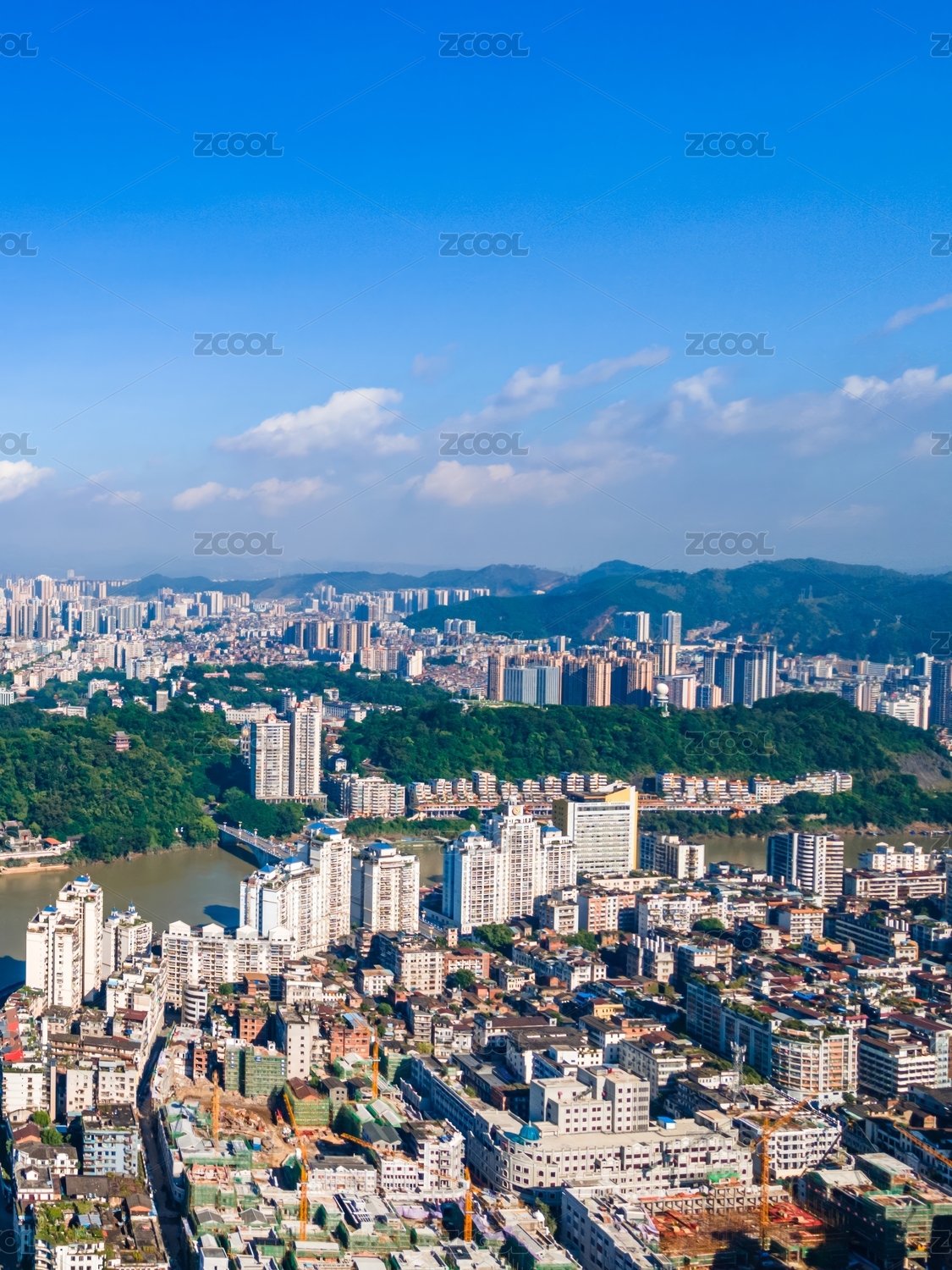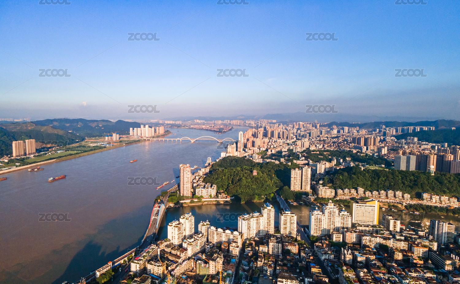 中国广西梧州万秀区城市风光和西江河流航拍