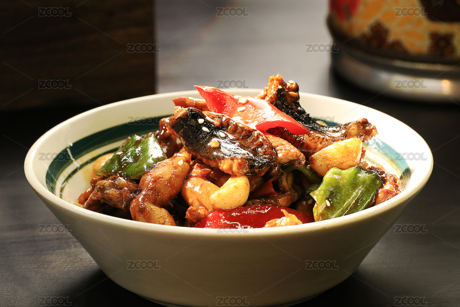 黑色木板上旧式敞口瓷碗中的田鸡烧鱼乔