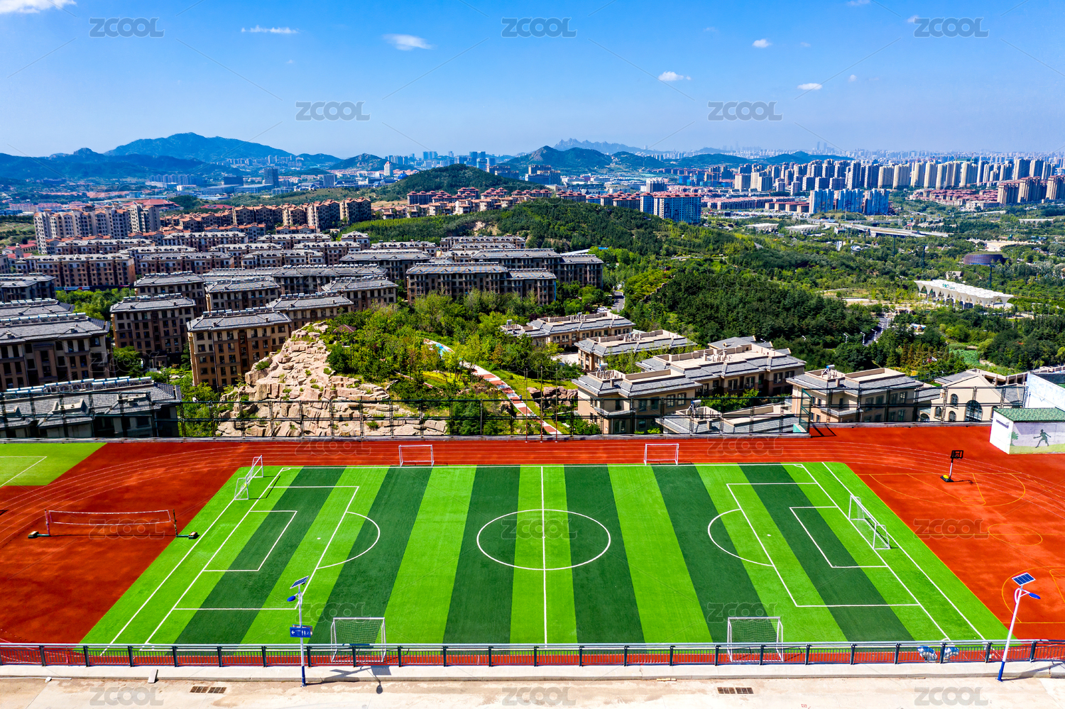 中国山东青岛世博园航拍室外足球田径场