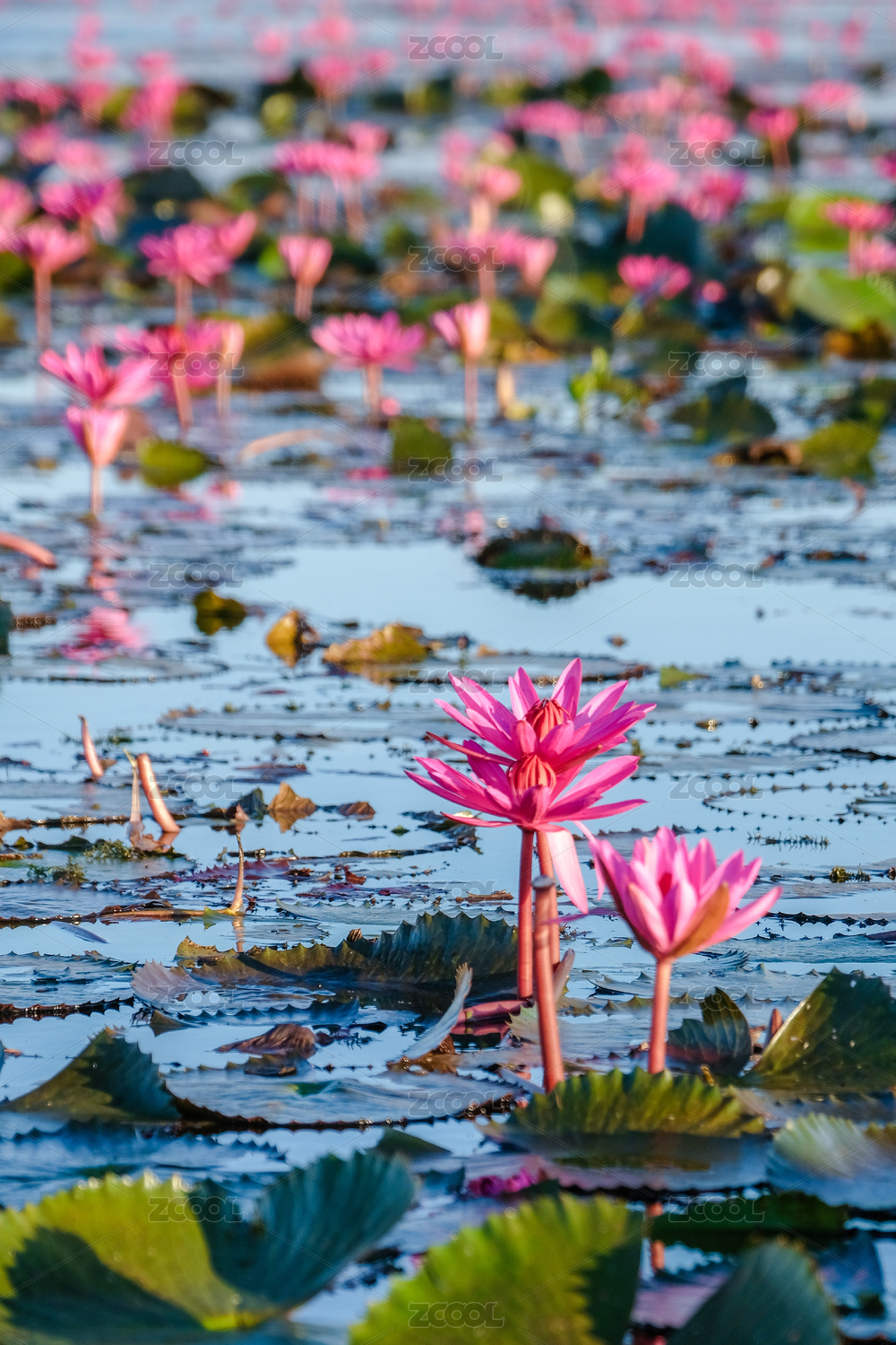泰国乌隆红莲湖满是荷叶的湖面上的红莲花