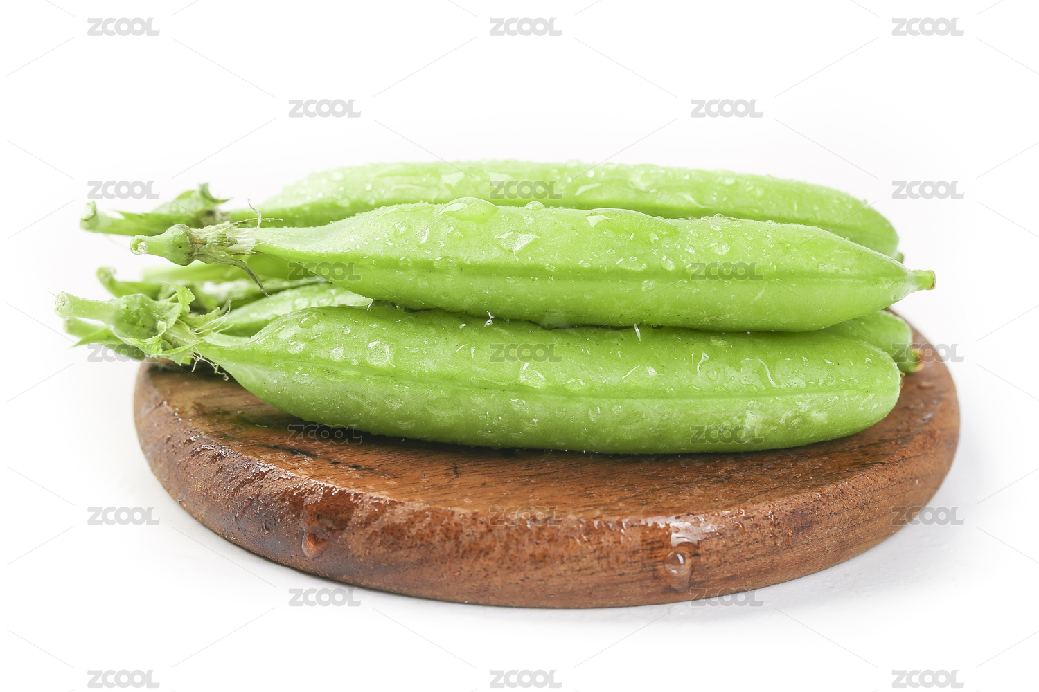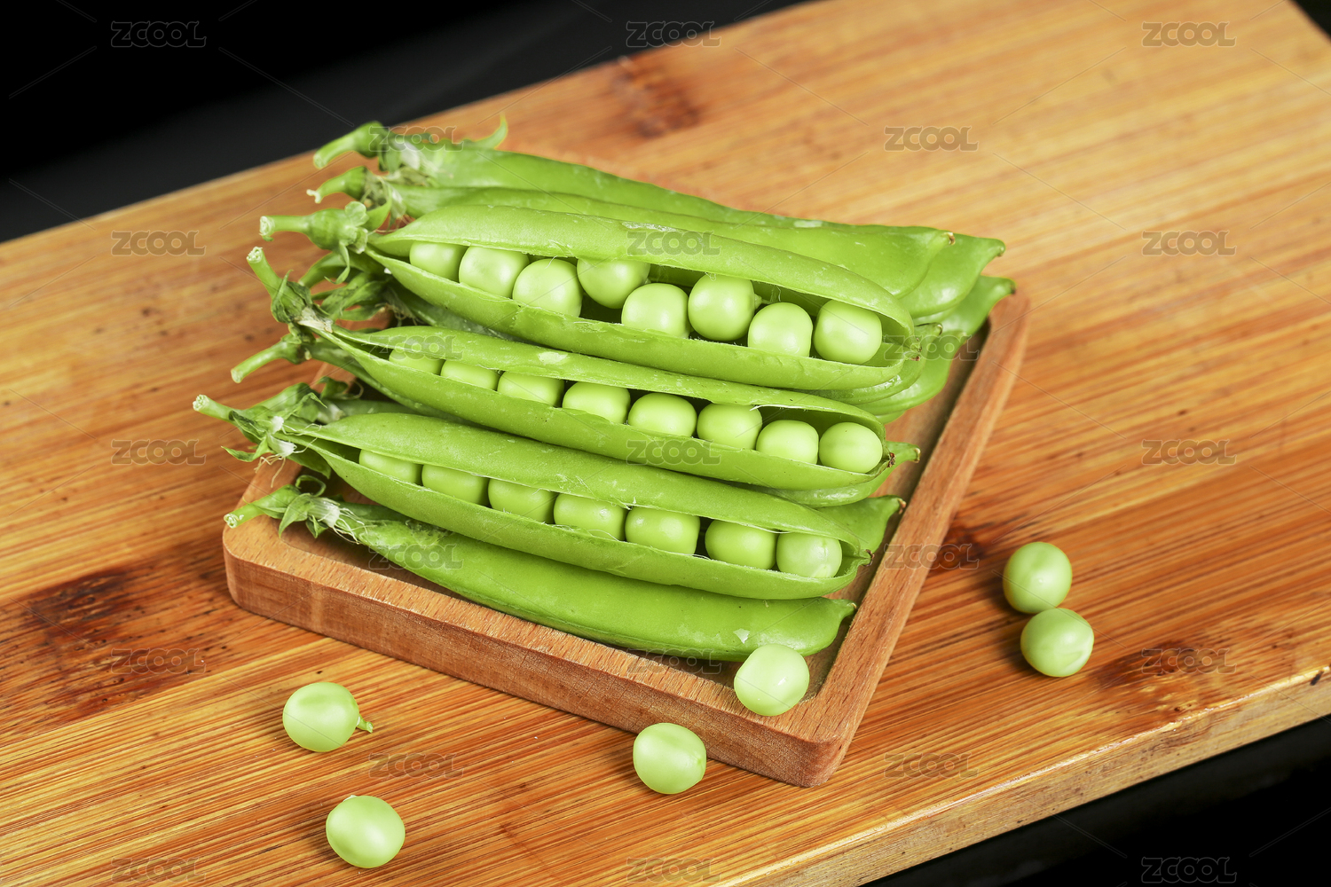 放在木托上的一盘豌豆荚