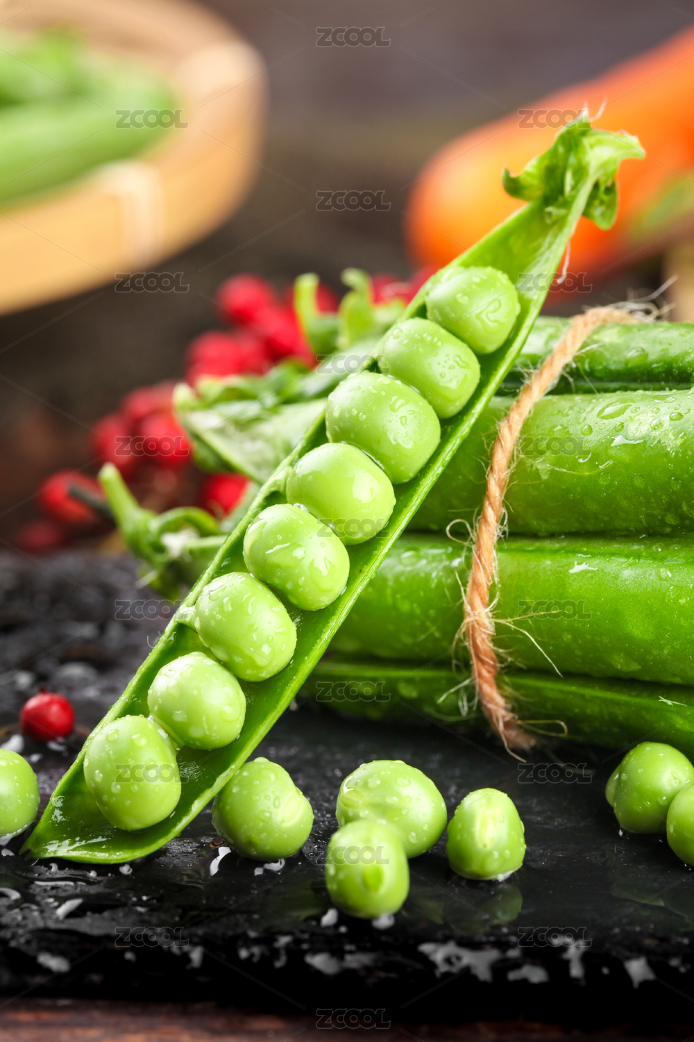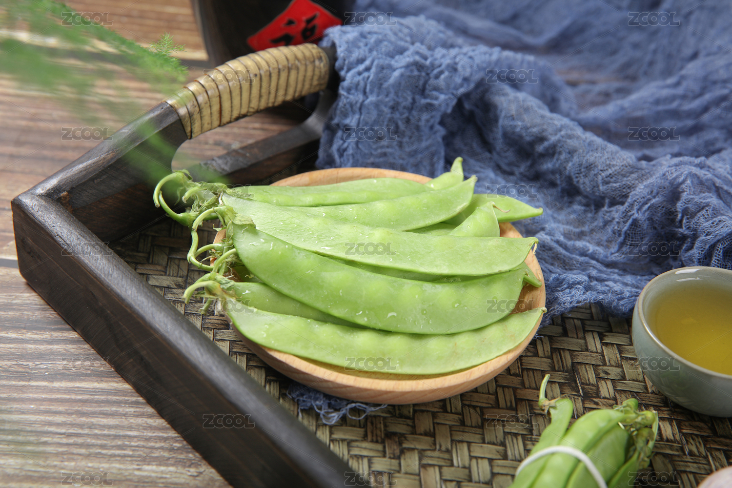 放在竹托盘上的菜豌豆