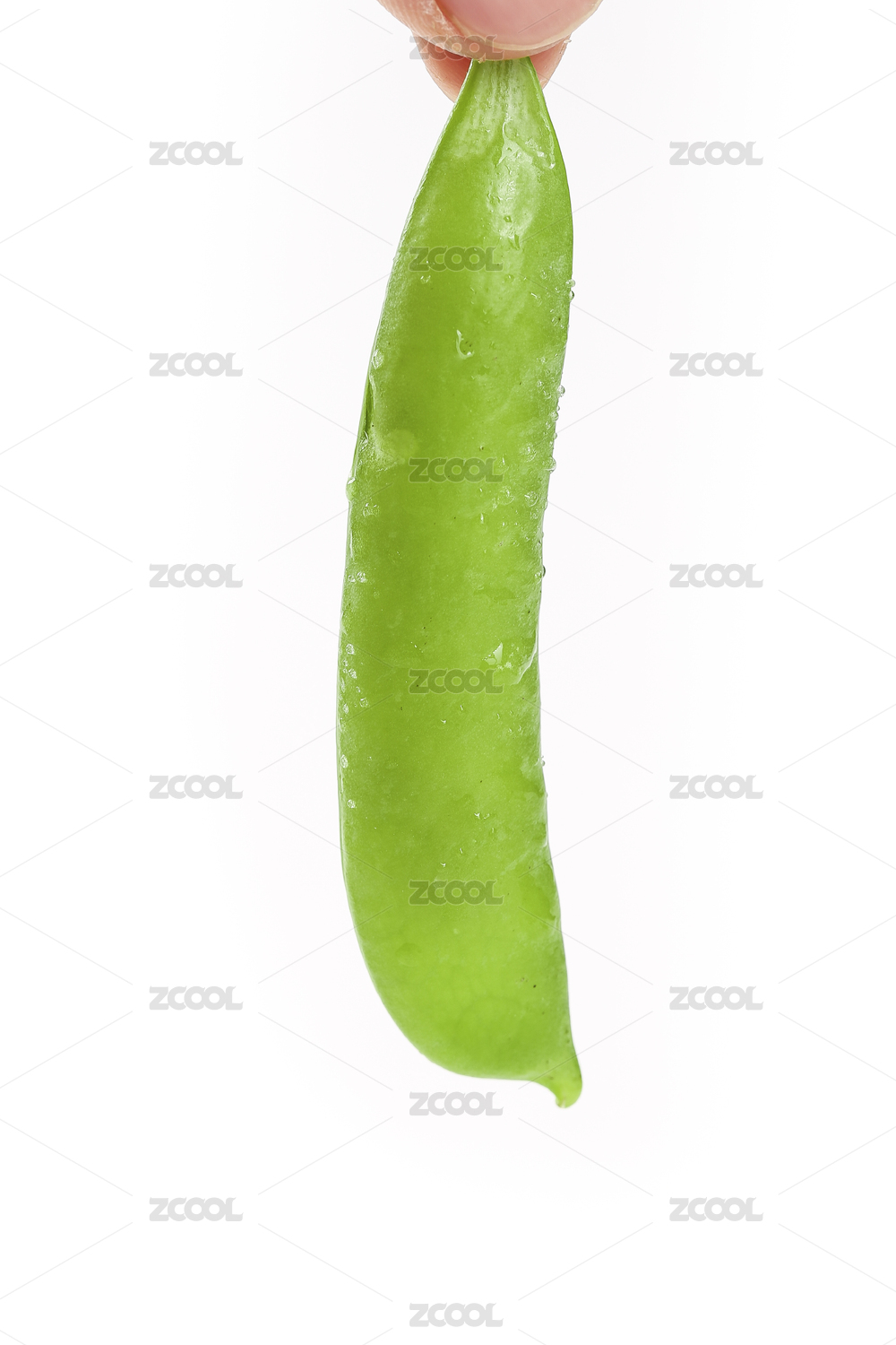 白底上放着三个完整的青豆荚
