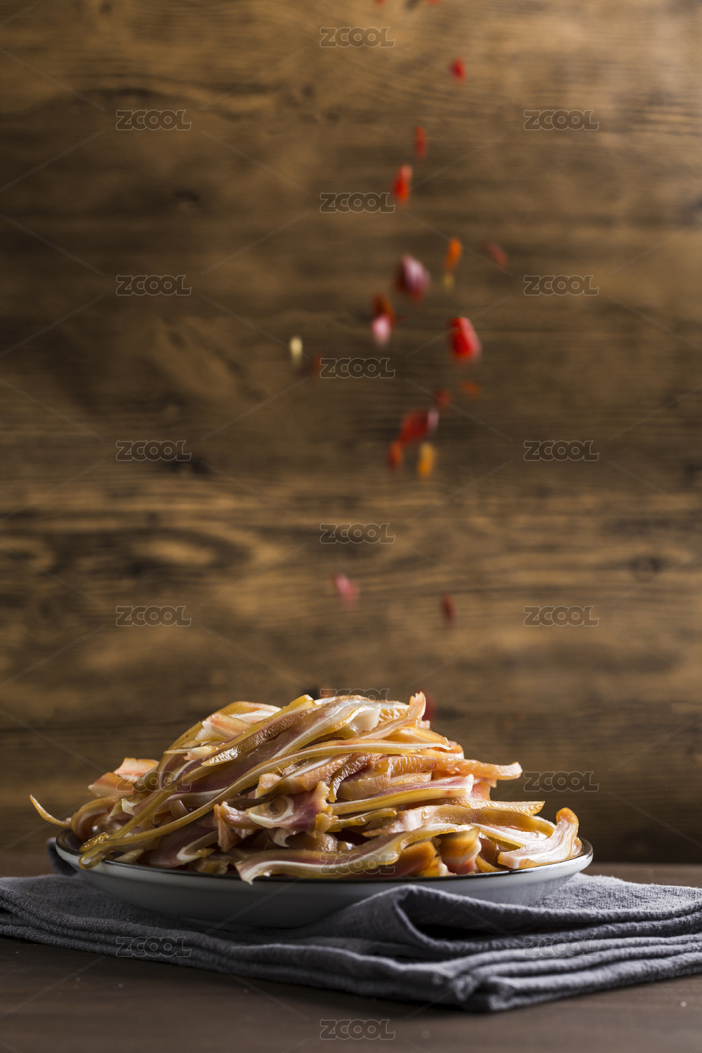辣椒碎跌落在一盘脆嫩的卤猪耳上