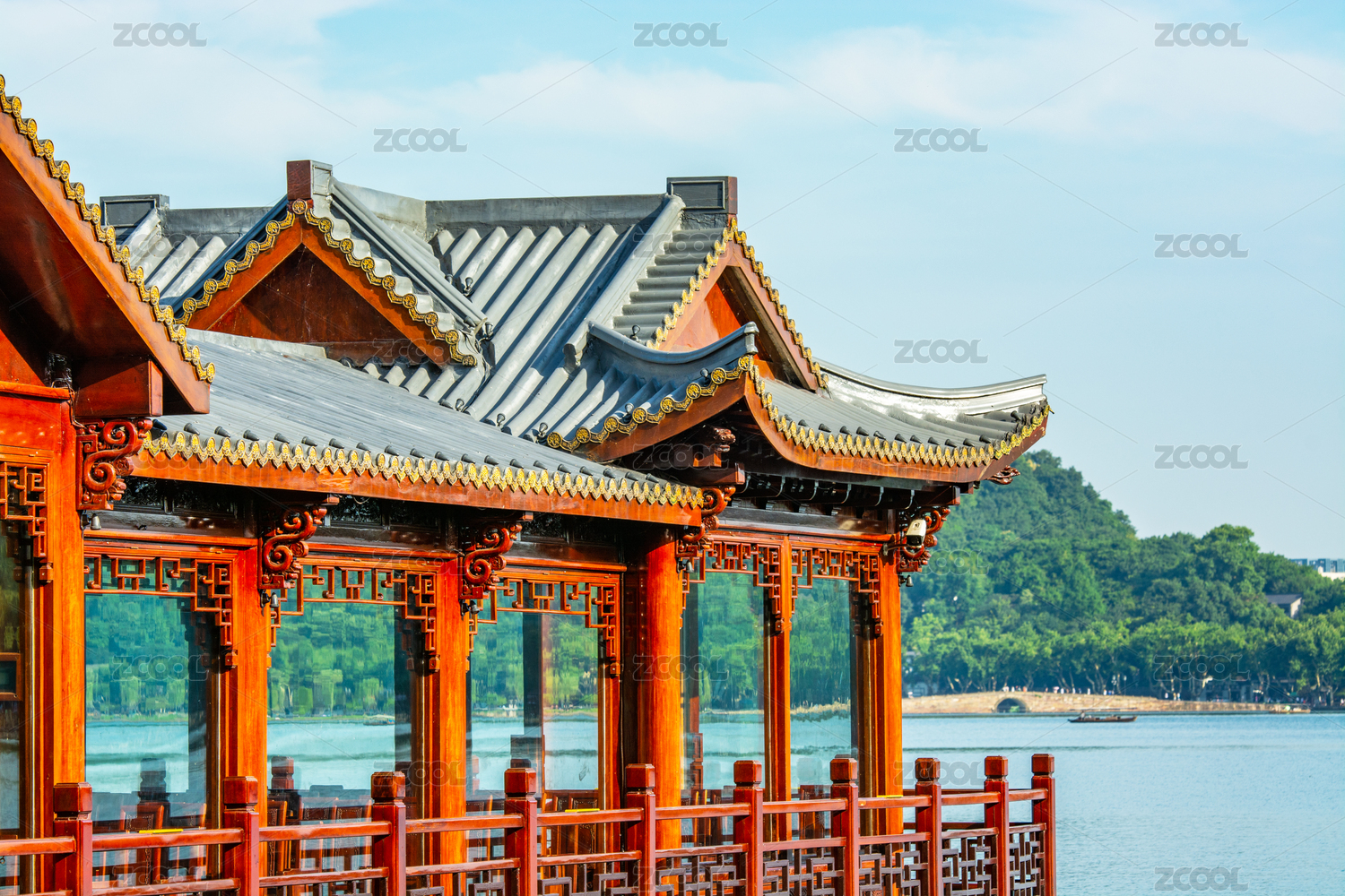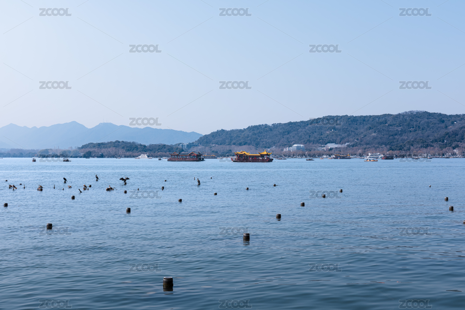 中国浙江杭州西湖,码头停泊的游船与画舫
