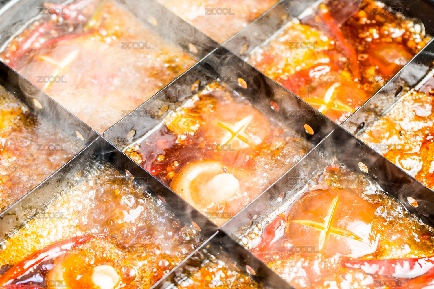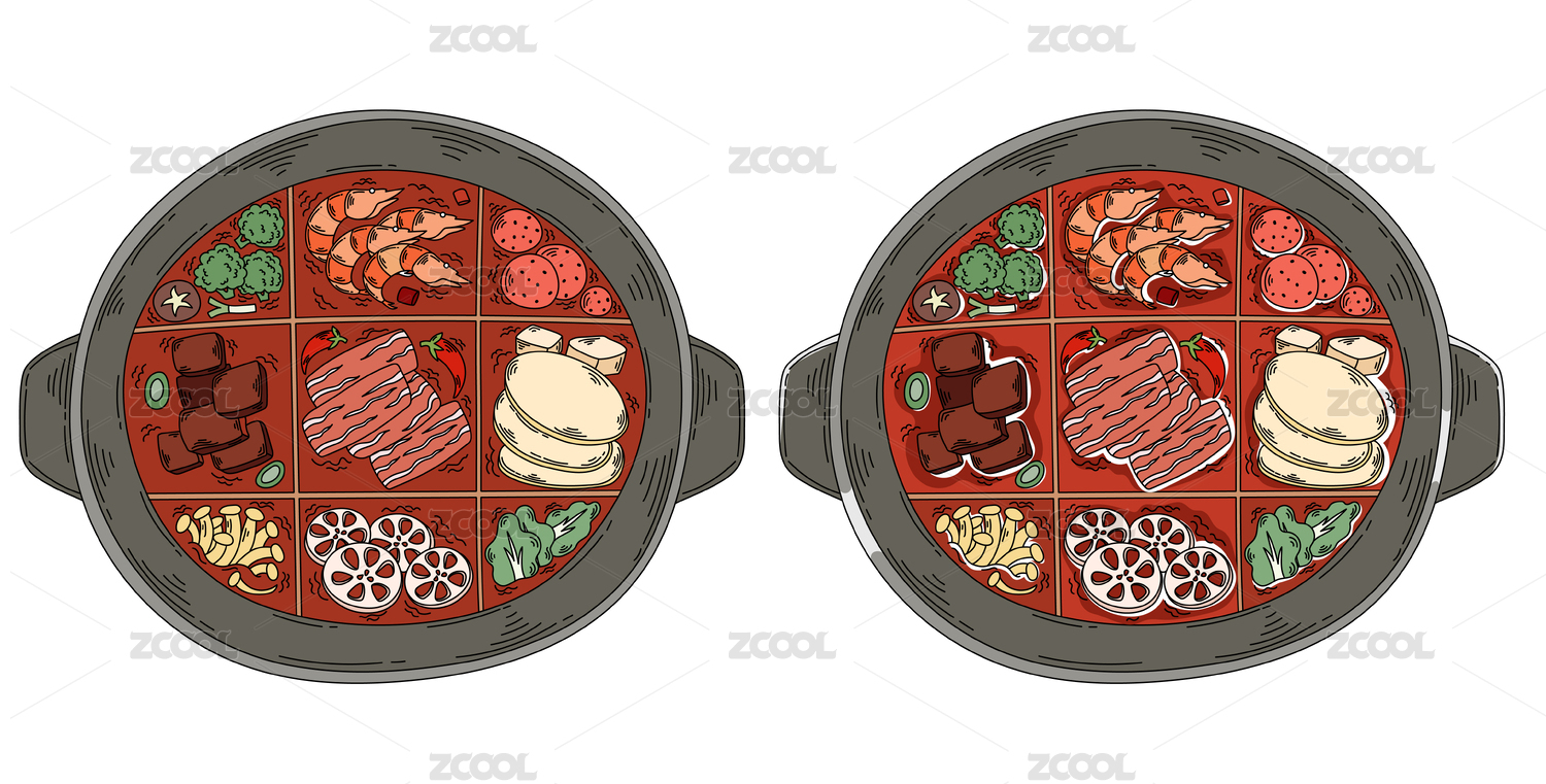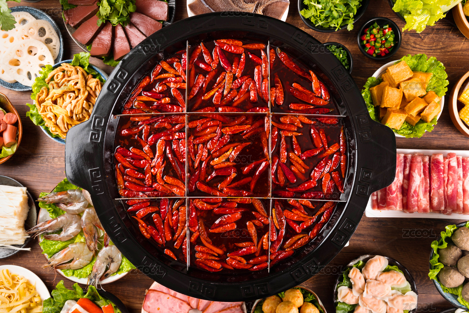 餐桌上摆满火锅食材,中间还有一盆九宫格火锅浓汤