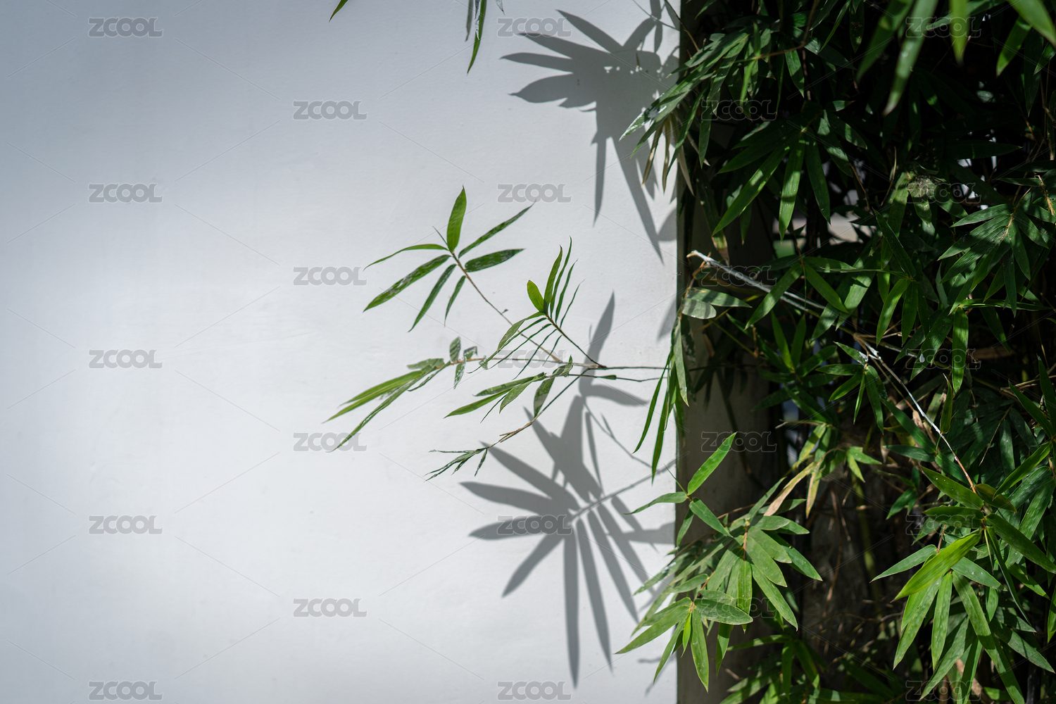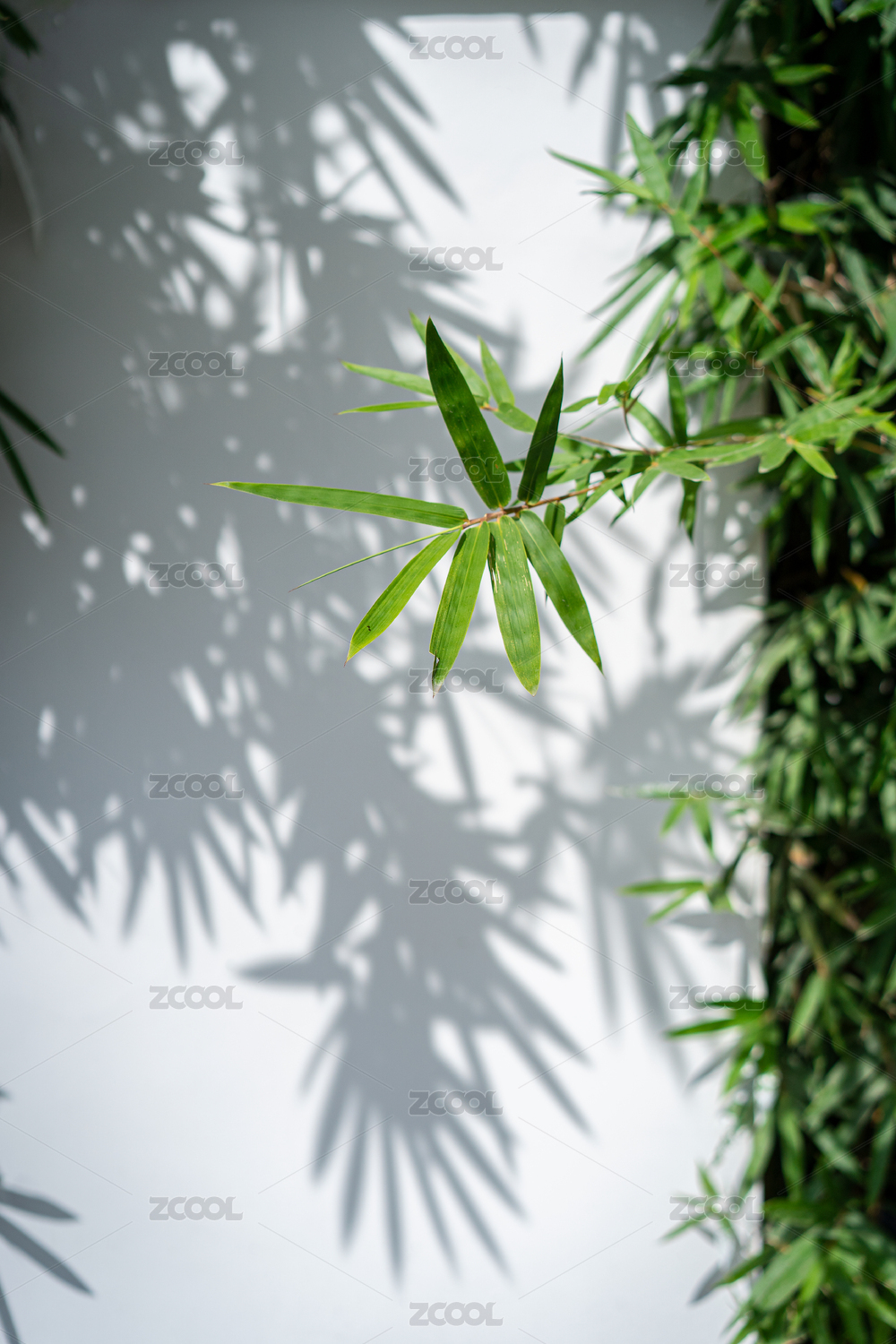 竹叶及其投射在白色墙壁上斑驳的影子