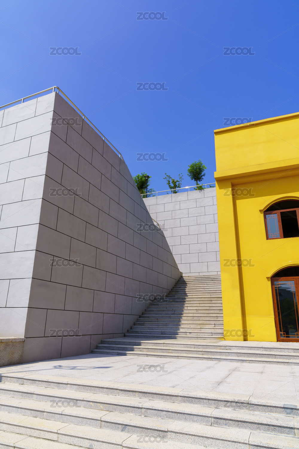 黄色房屋和白色墙壁之间的青石台阶