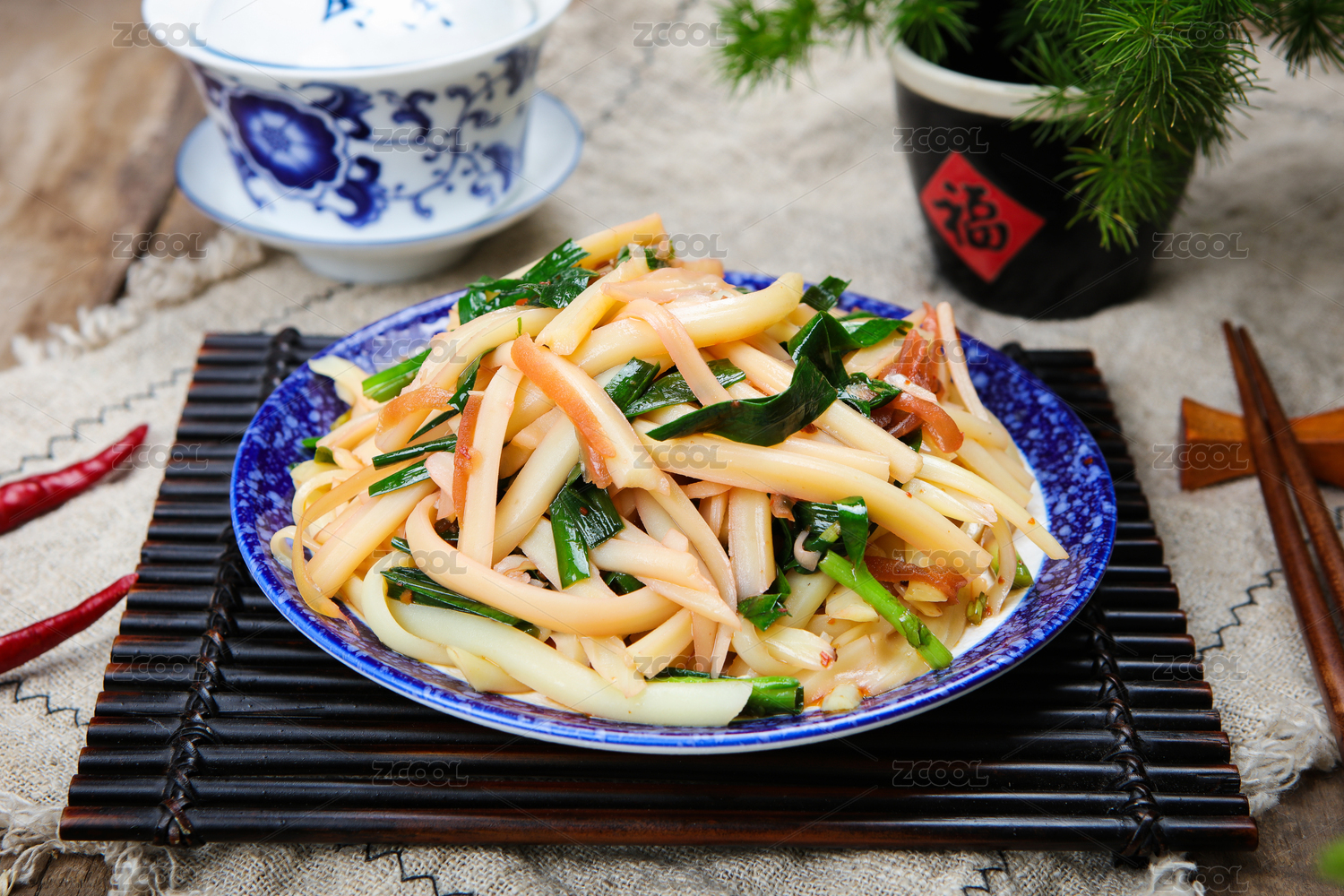 木桌背景的西兰花瘦肉凉拌麻辣米皮的