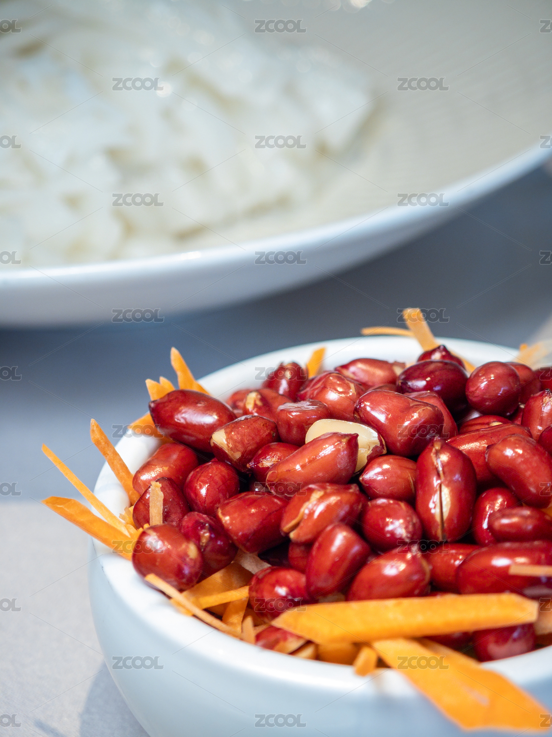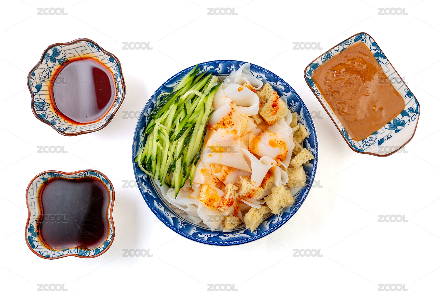 浅色背景上餐具里摆放的凉拌凉皮