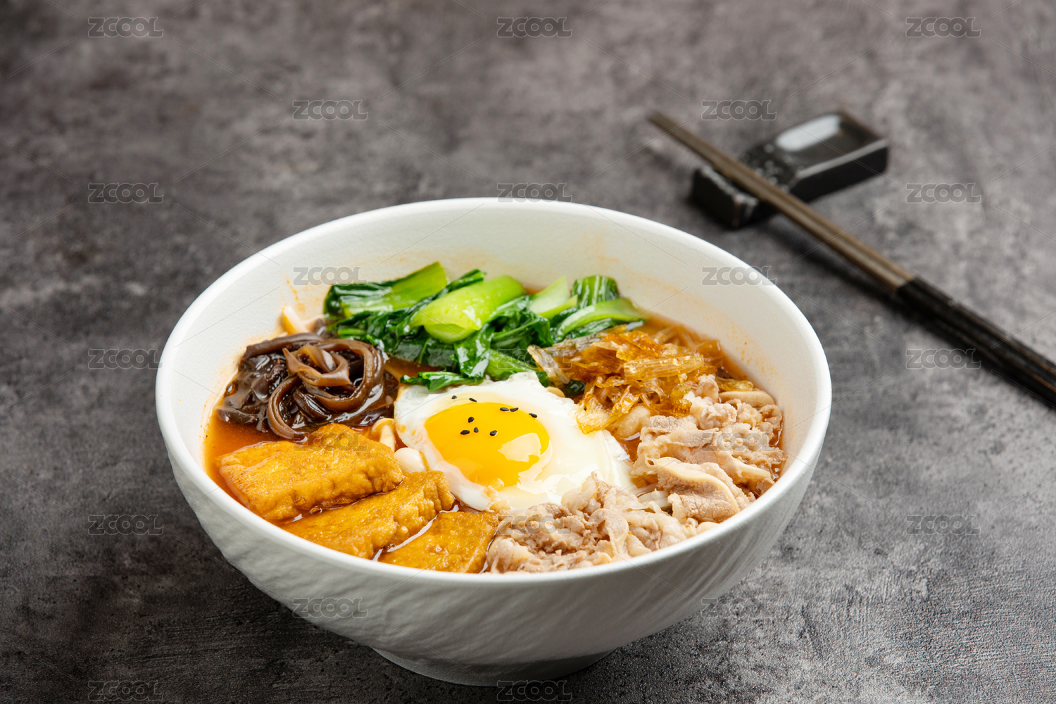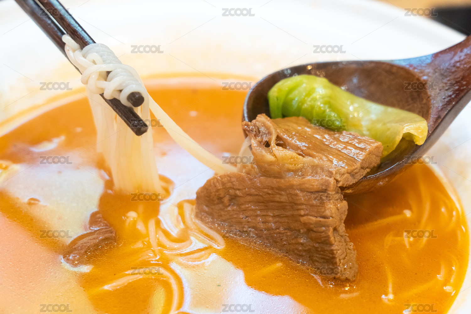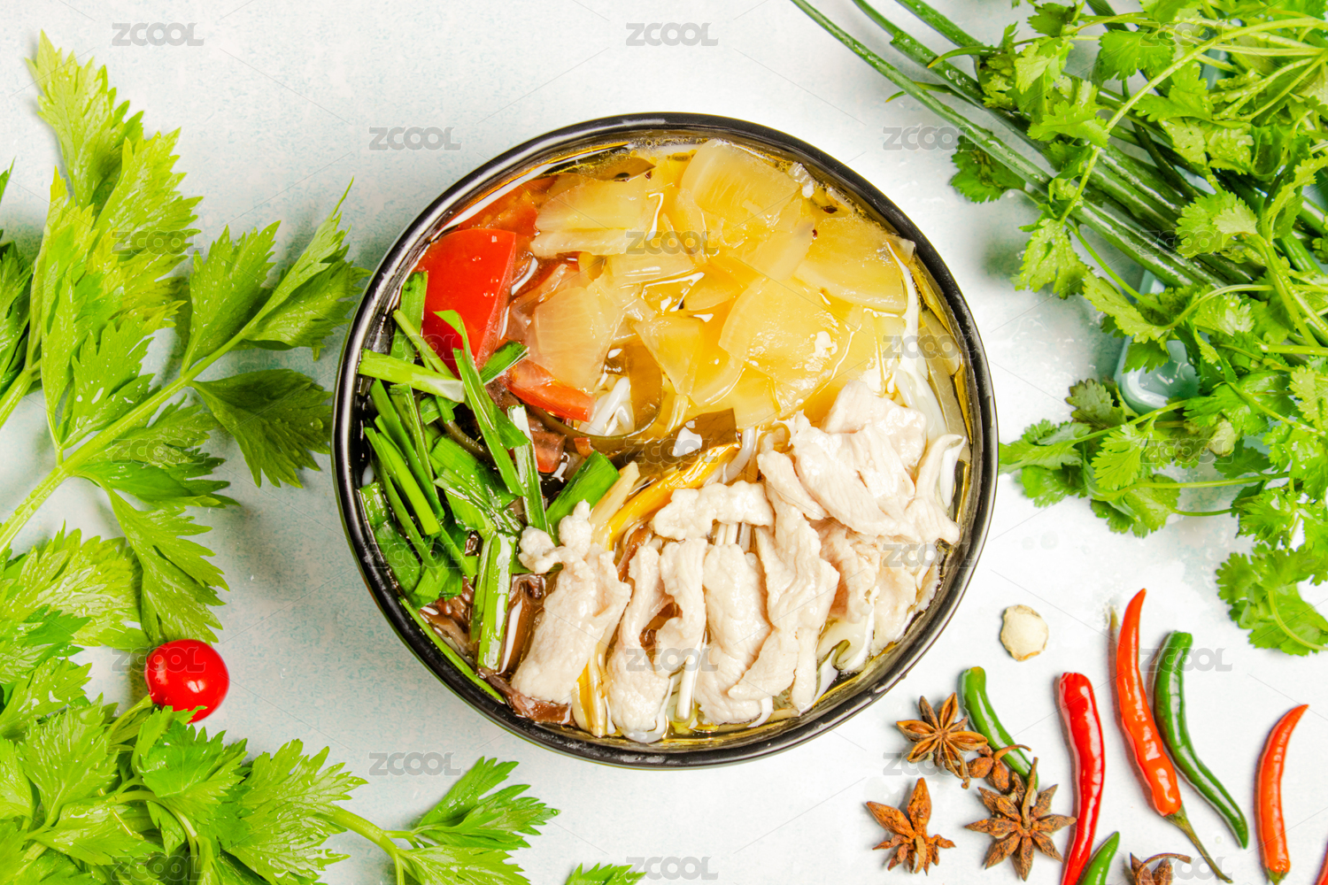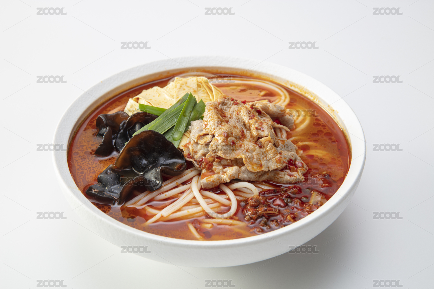 白色大碗里的香辣水煮肉片火锅米线