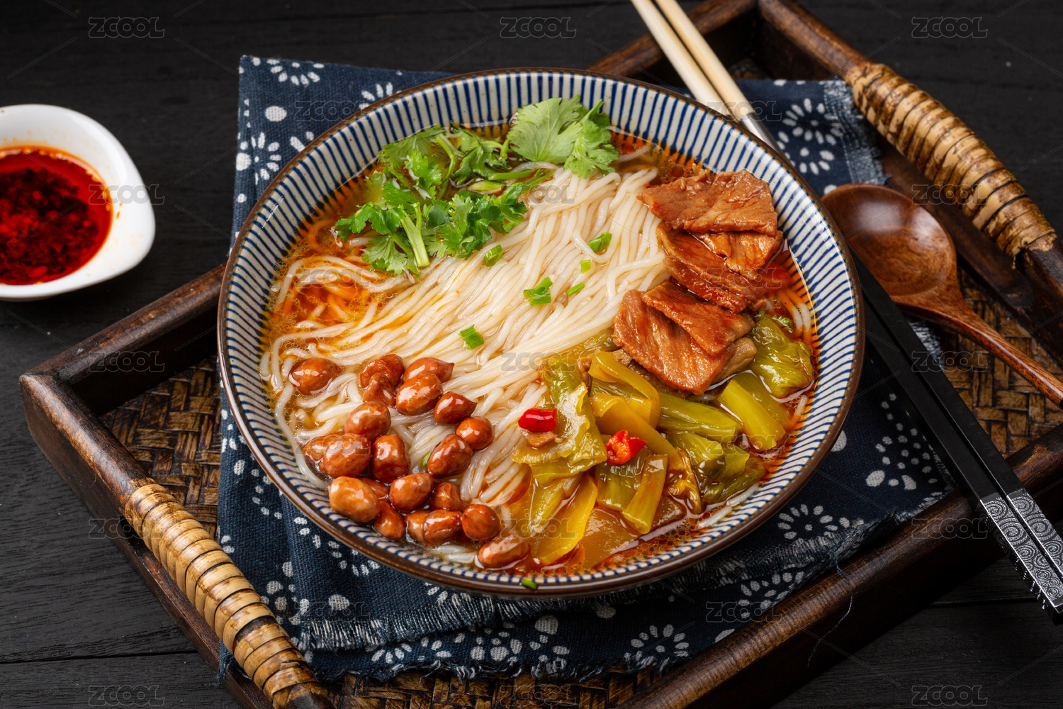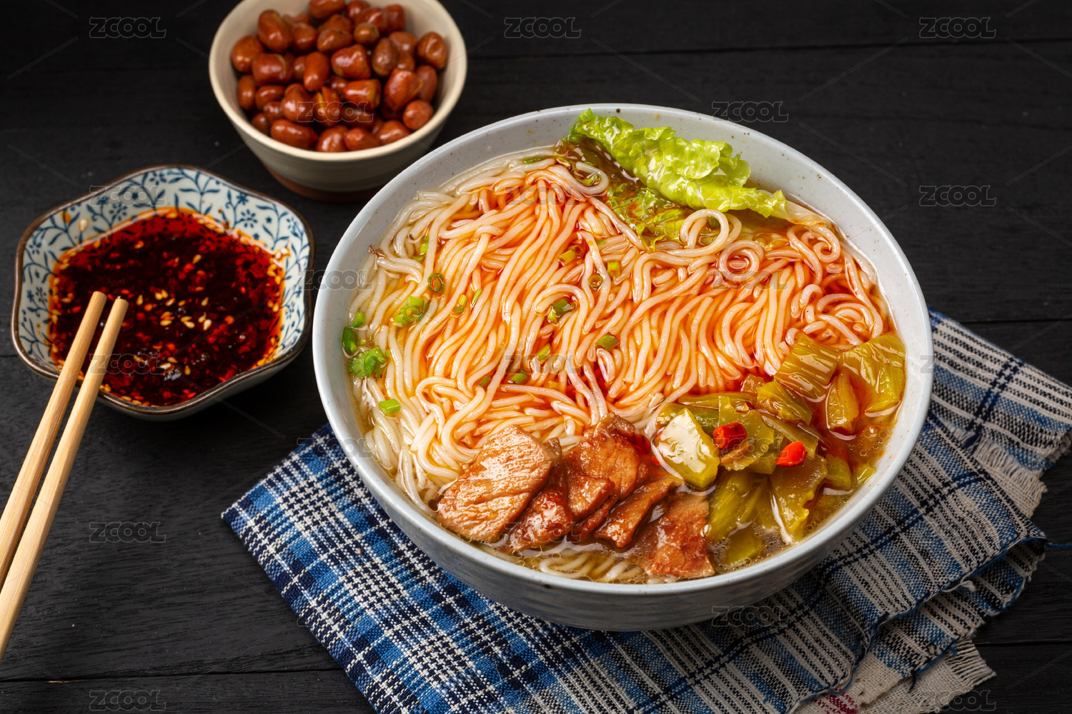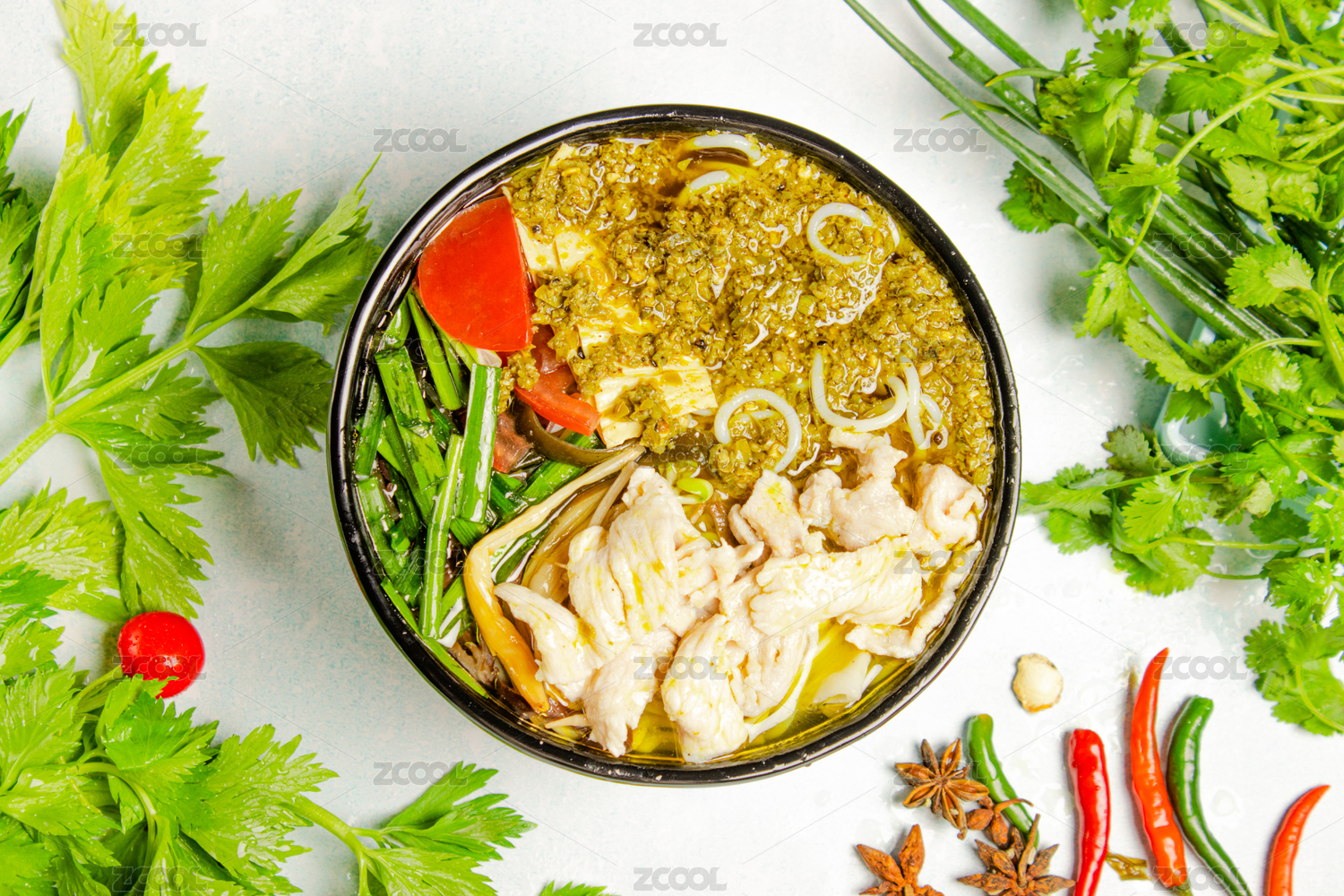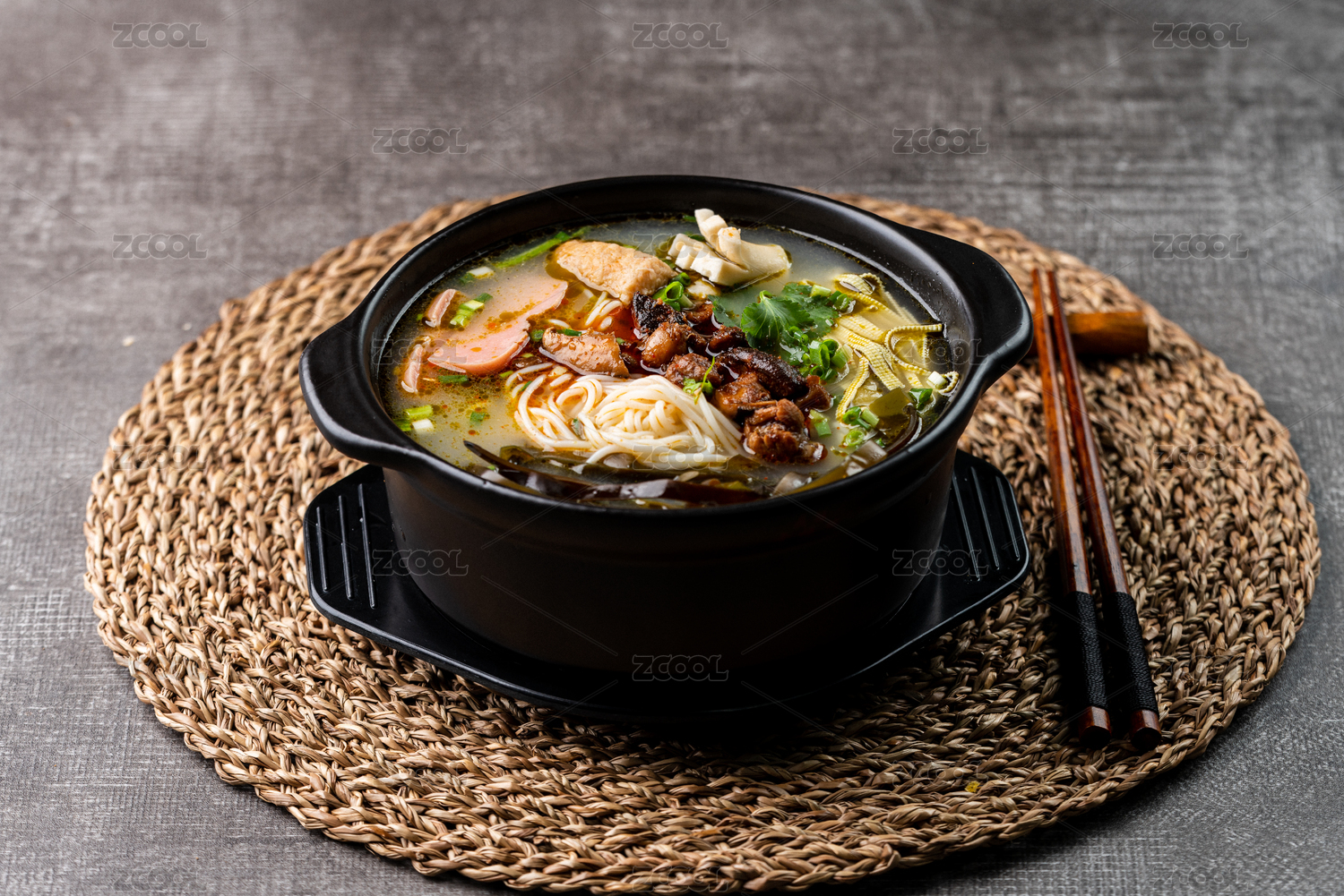 黑色大碗里的麻辣红汤滑肉片米线米粉