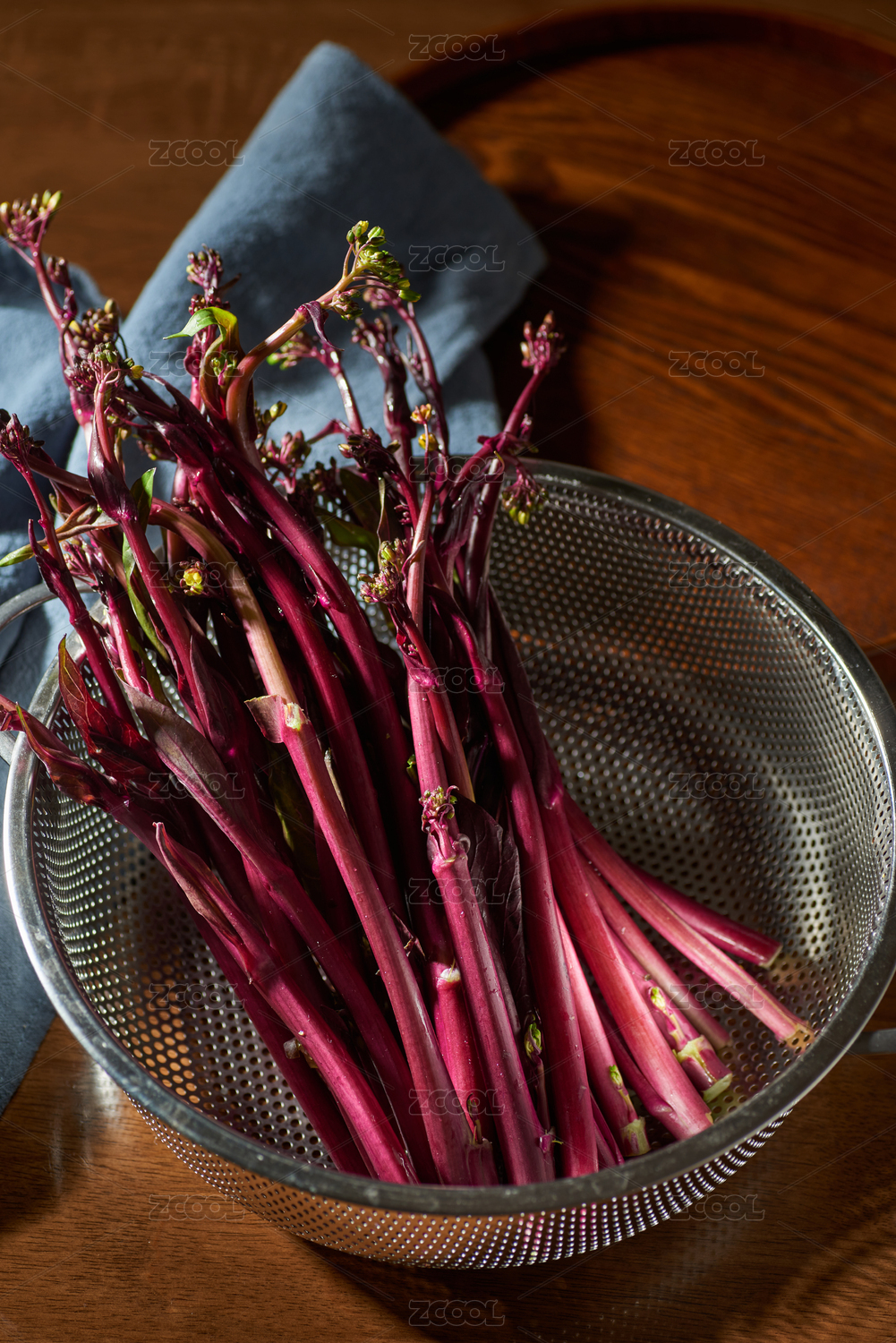 不锈钢洗菜篮里鲜嫩可口的洪山菜薹