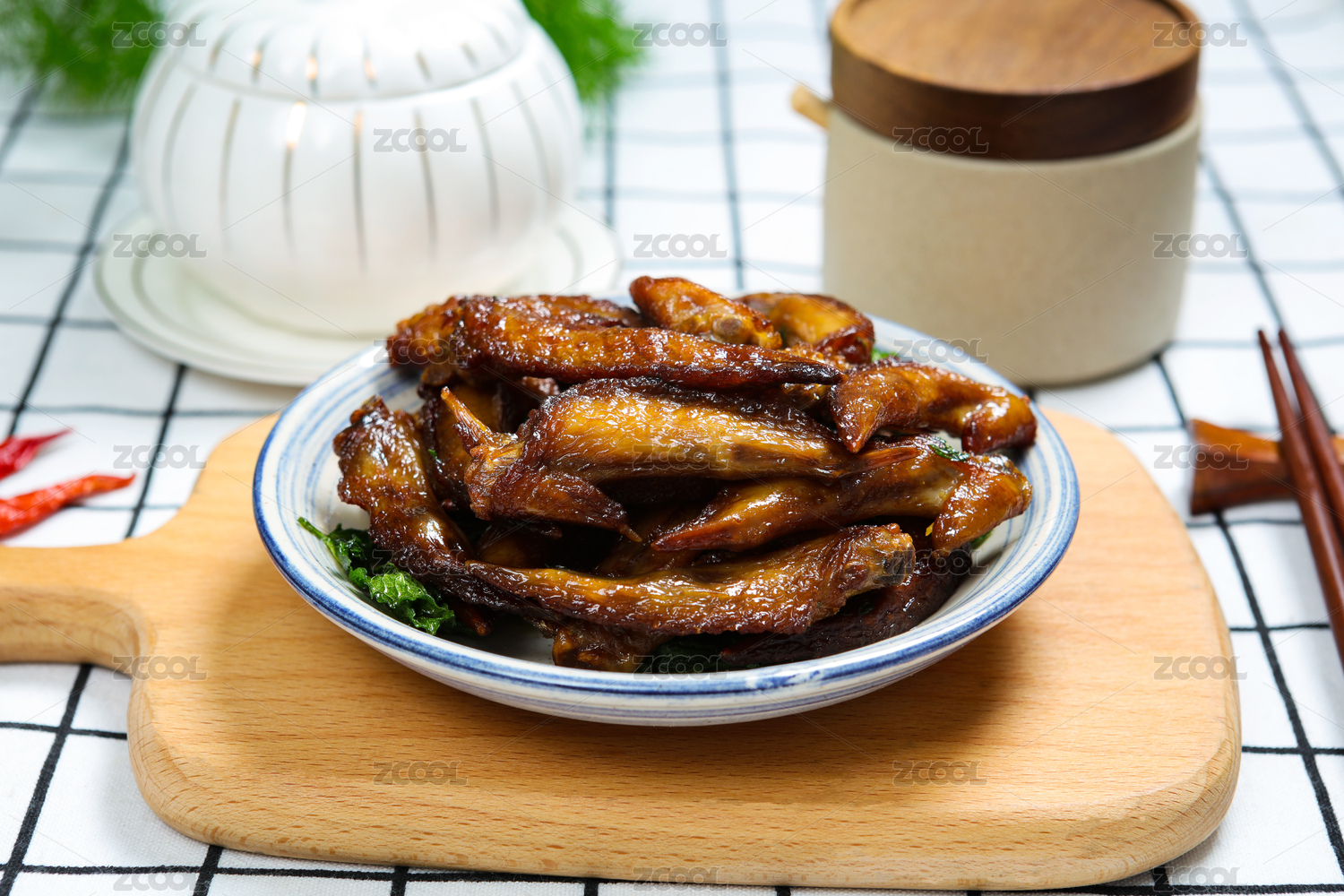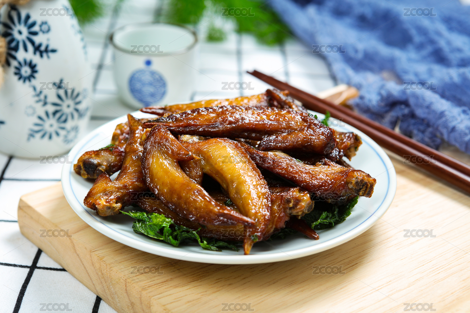 桌面上的盘子里的美味可口的鸡翅膀