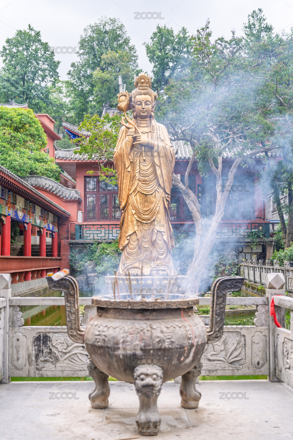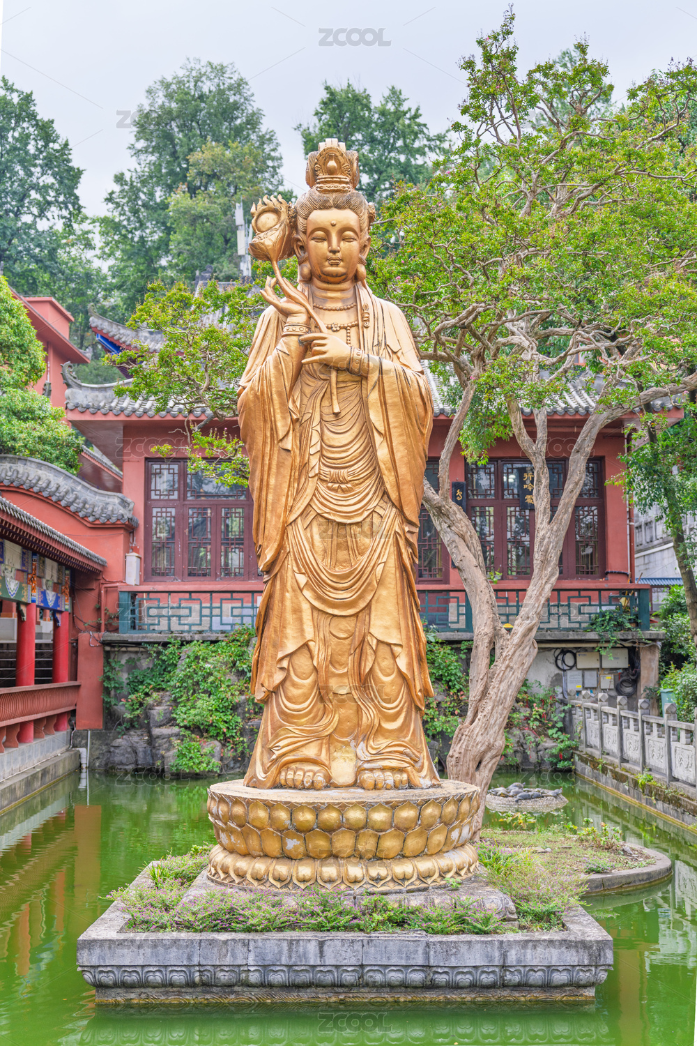中式园林中的金色观音像