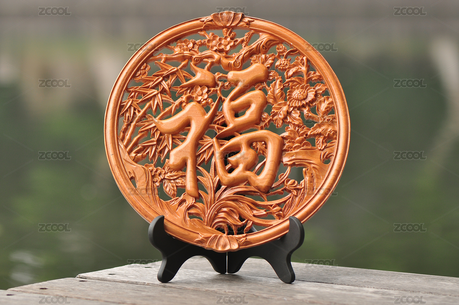 河边木板上的四季福桃木圆盘摆件