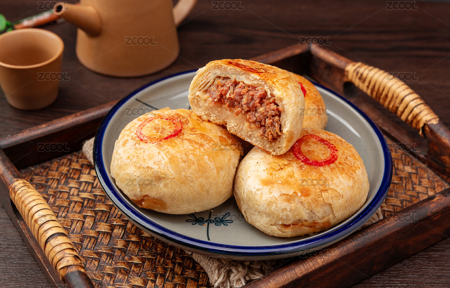 一盘牛肉烧饼摆放在木桌面上特写