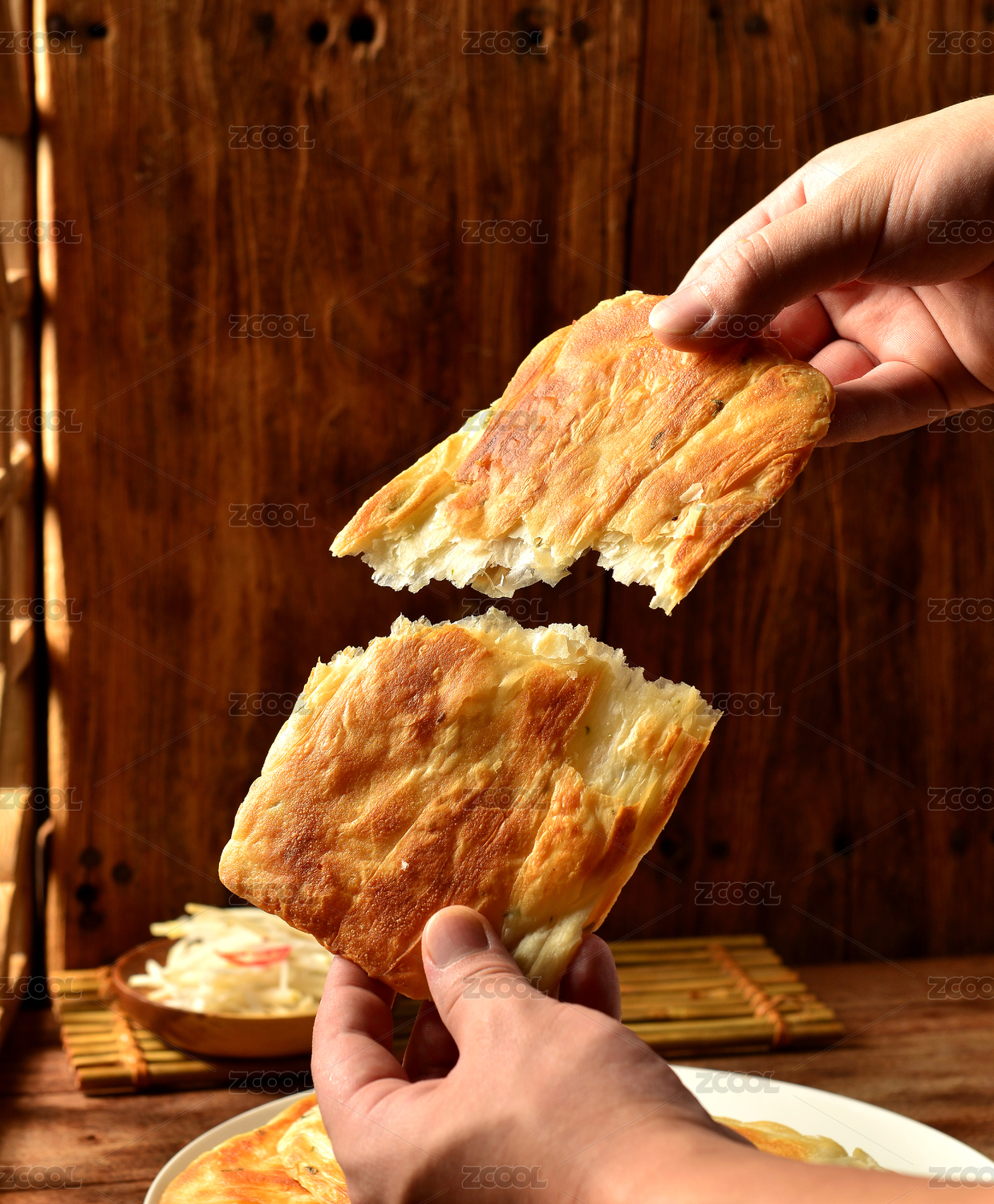 装在盘子里掰开的牛肉烧饼