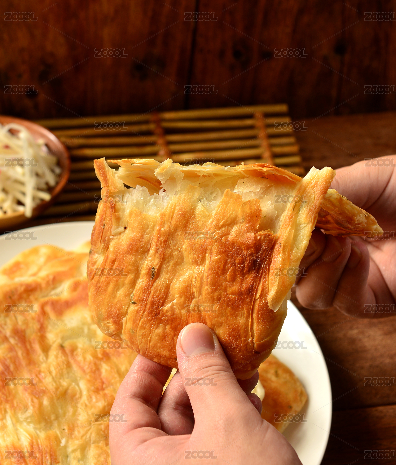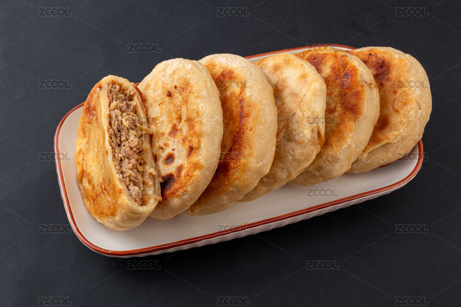 餐桌上盘子里的天津小吃牛肉烧饼