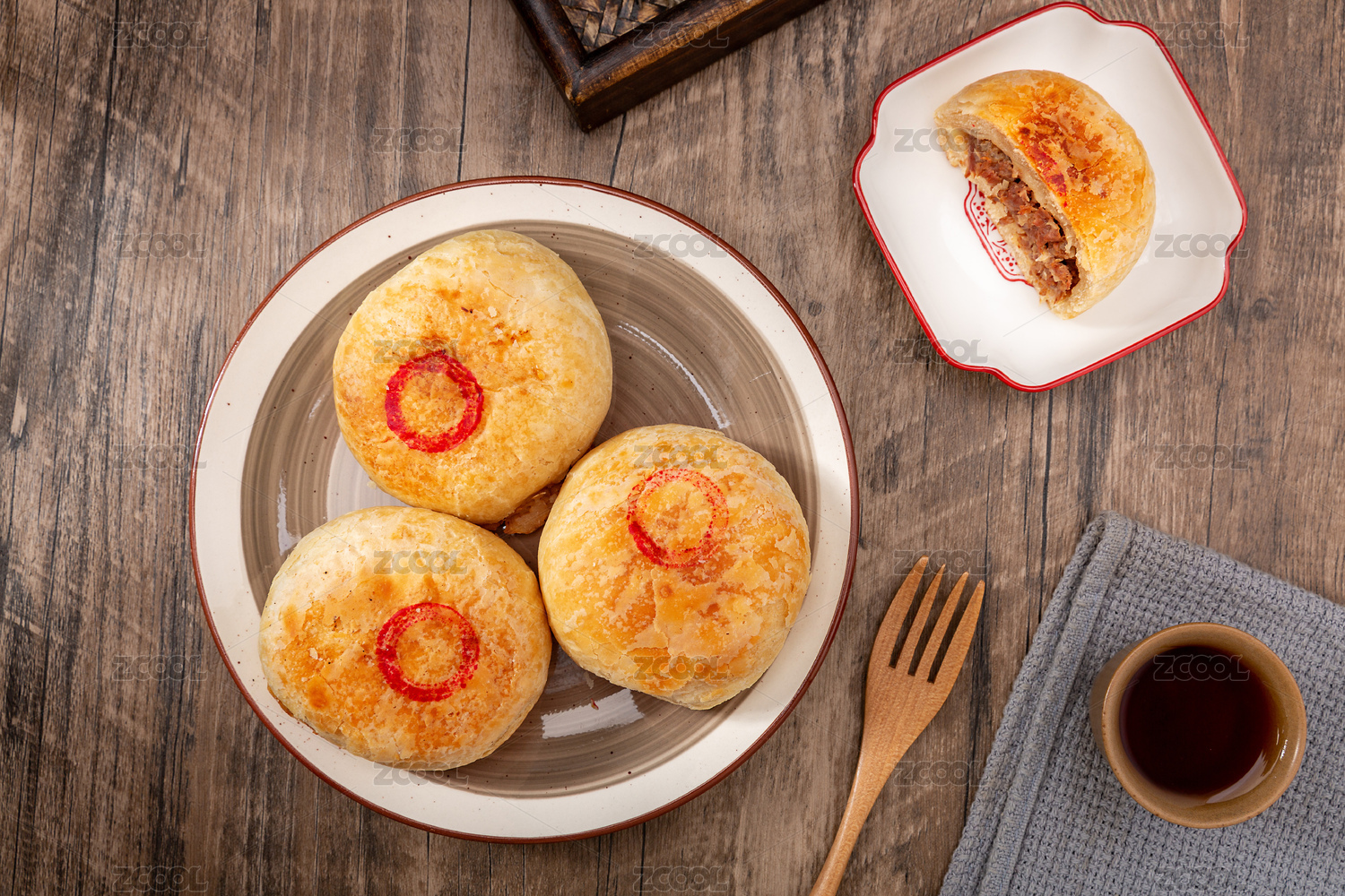 俯拍餐桌上盘子里的三个牛肉烧饼
