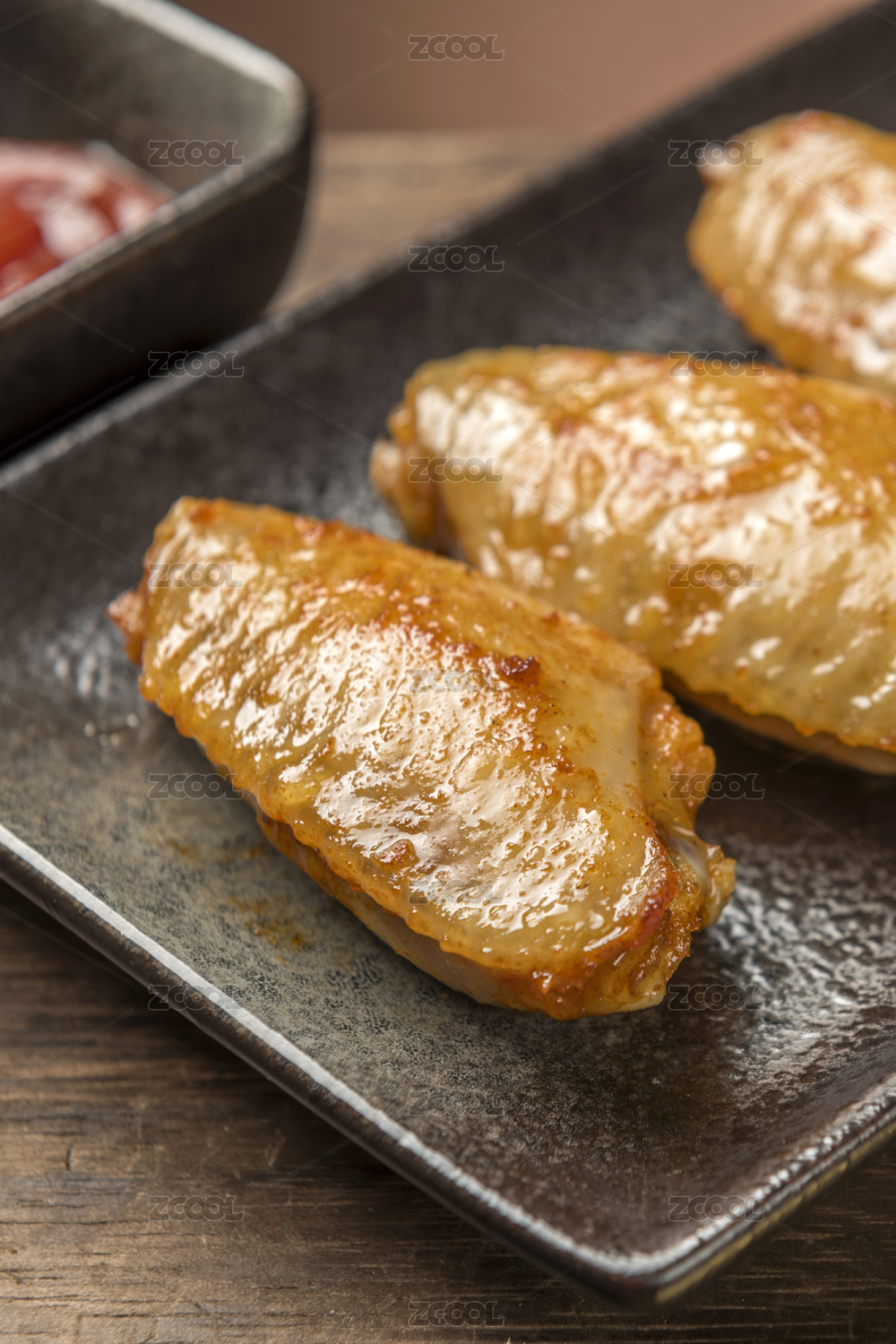 一盘烤鸡翅烤鸡翅中摆放在木桌面上特写