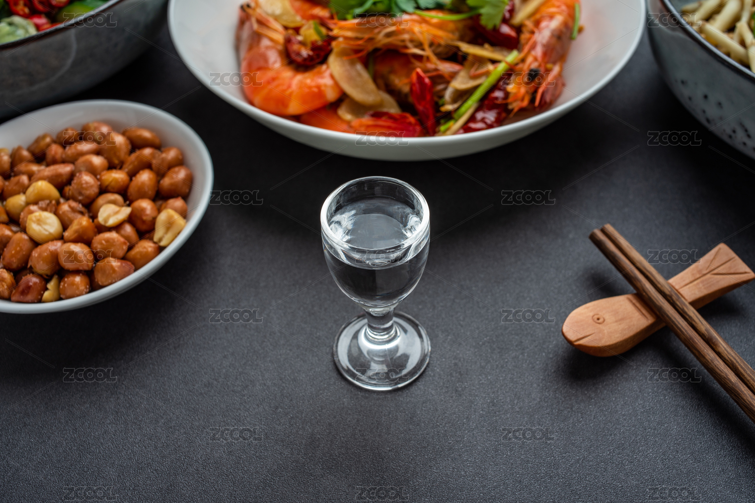 白酒和一桌中餐家常菜香辣虾