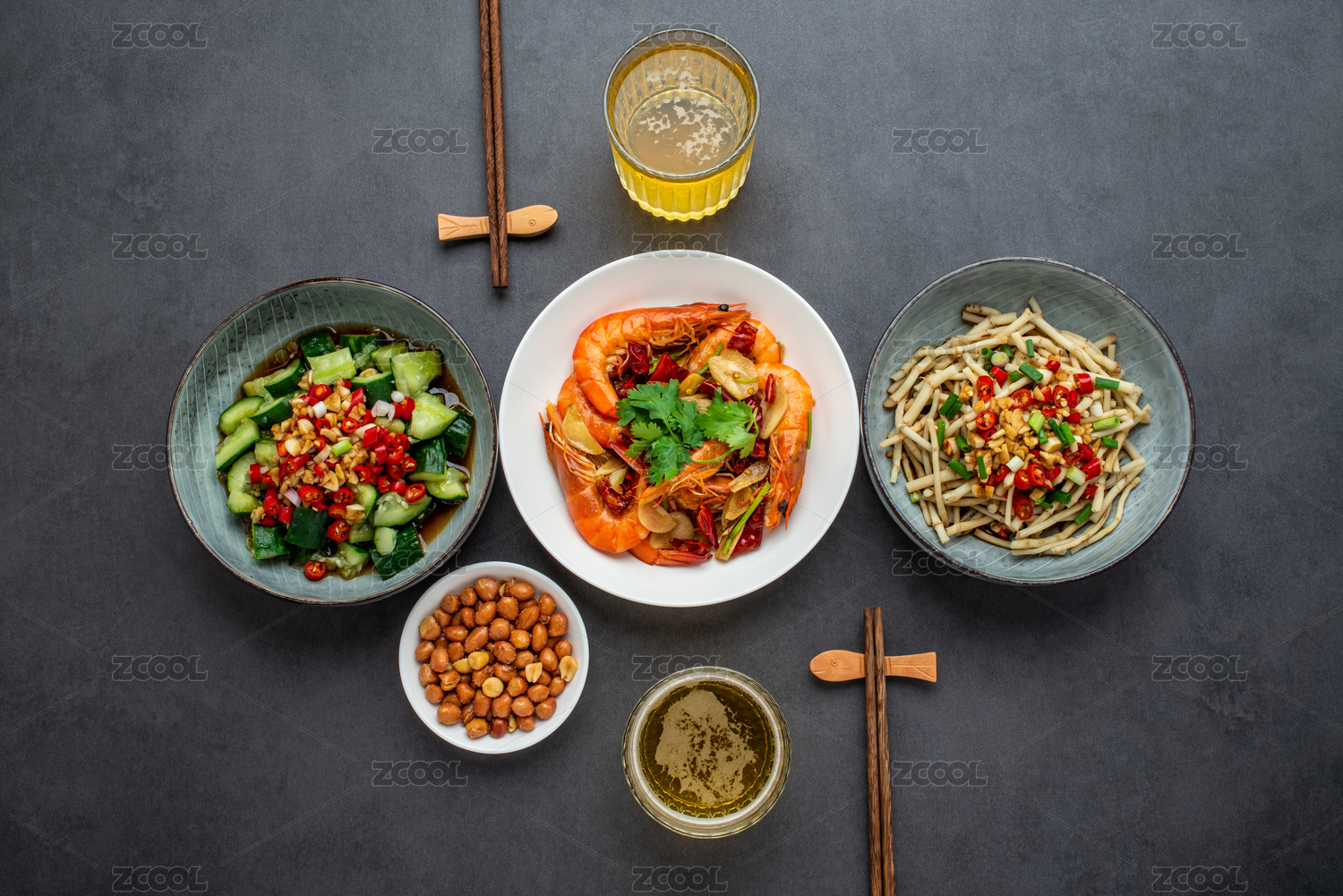 两杯白酒和家常小菜香辣虾凉拌黄瓜