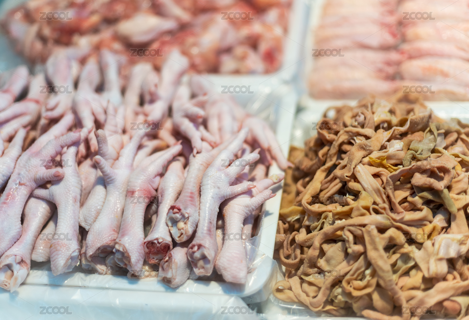 市场上的生鲜鸡爪鸡肠鸡翅等食材